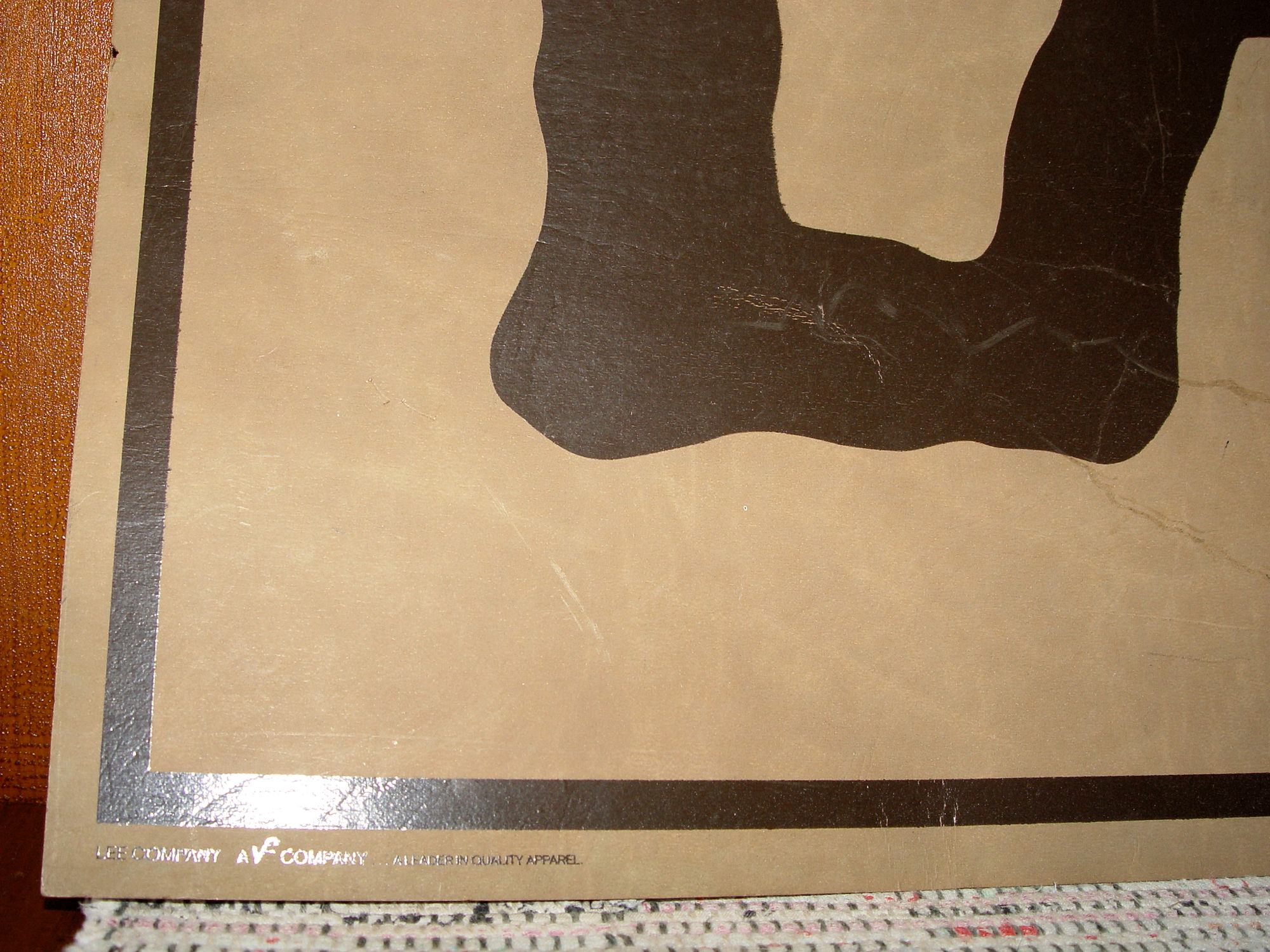 Great advertising poster for Lee Jeans. This is in very good condition with only a very slight amount of edgewear. Lee in Vynal as is the surrounding border. Hard to find. 23" X 15" Copy Of the Leather Patch on the jeans.