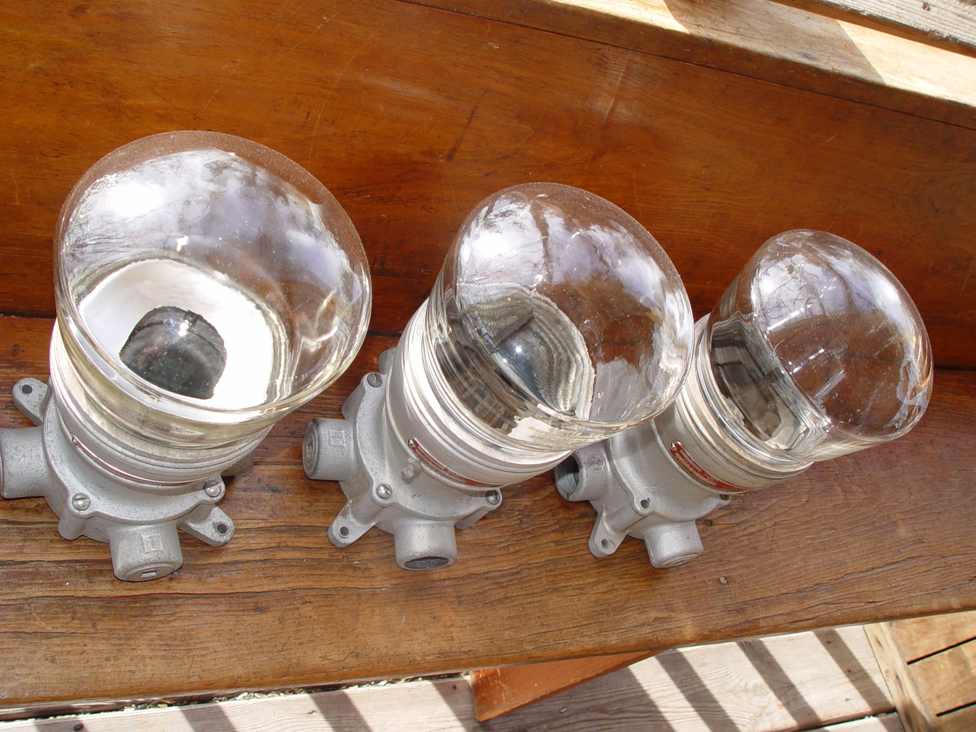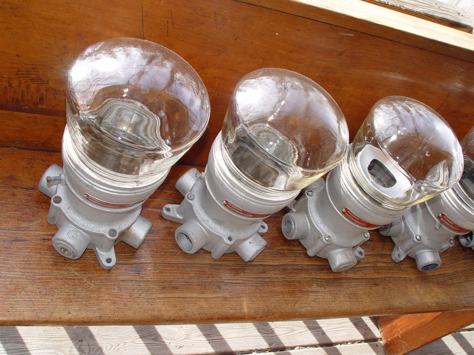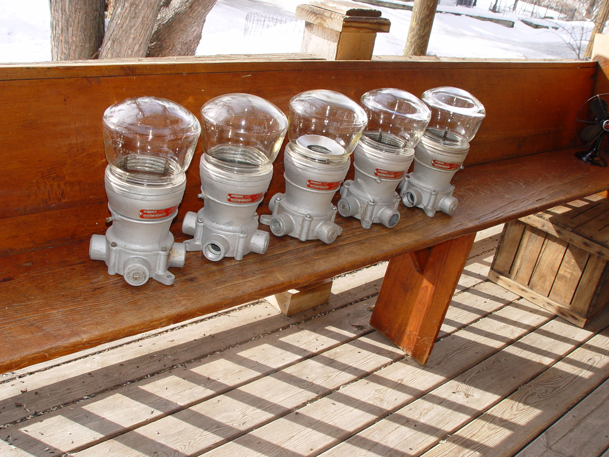 Five vintage Crouse Hinds explosion proof Industrial lights with threaded glass globes. Crouse Hinds is a historical electrical equipment manufacturer founded in 1897.