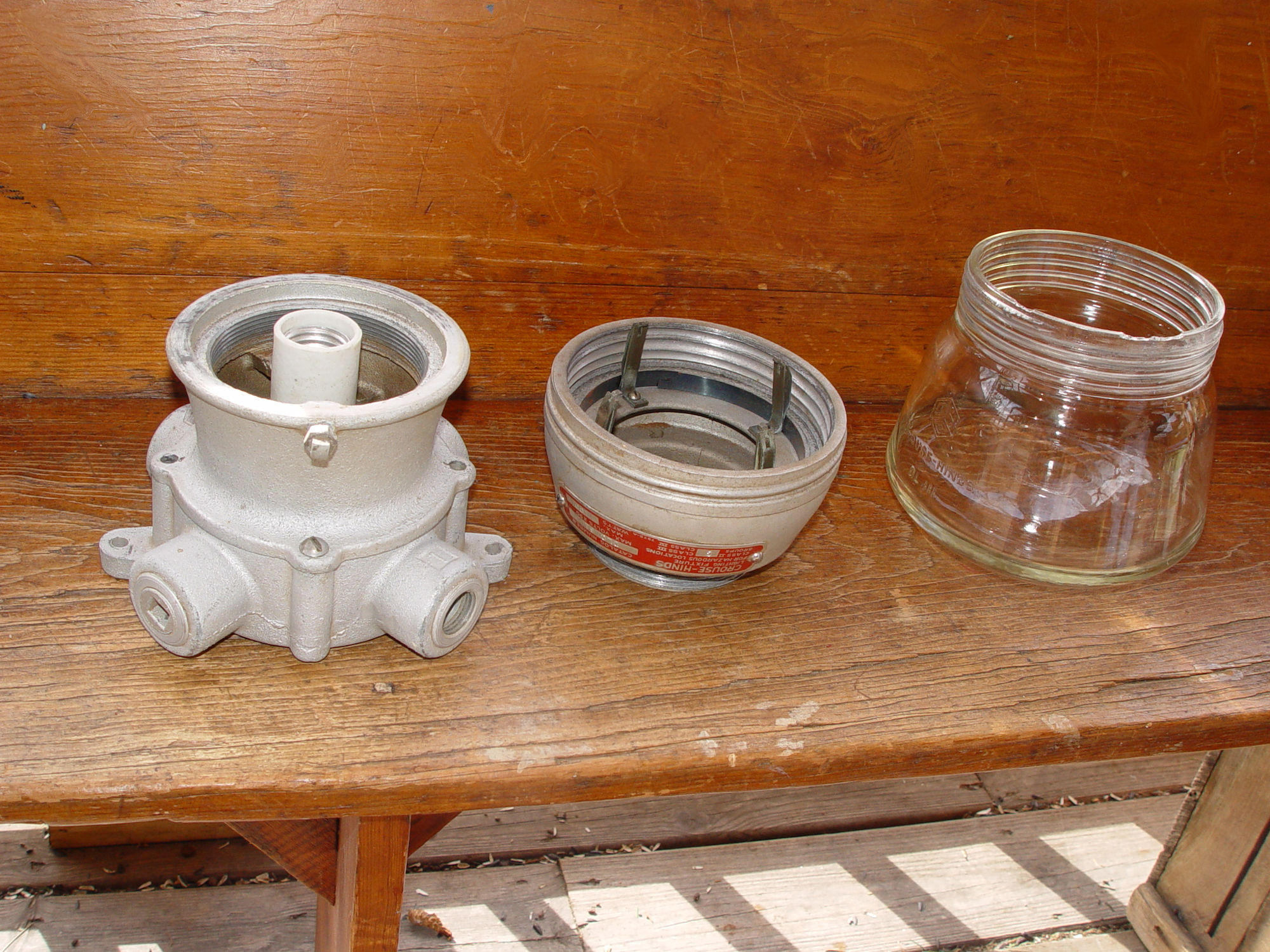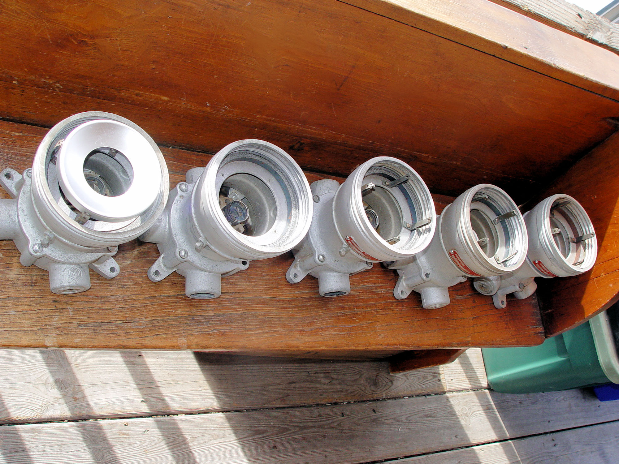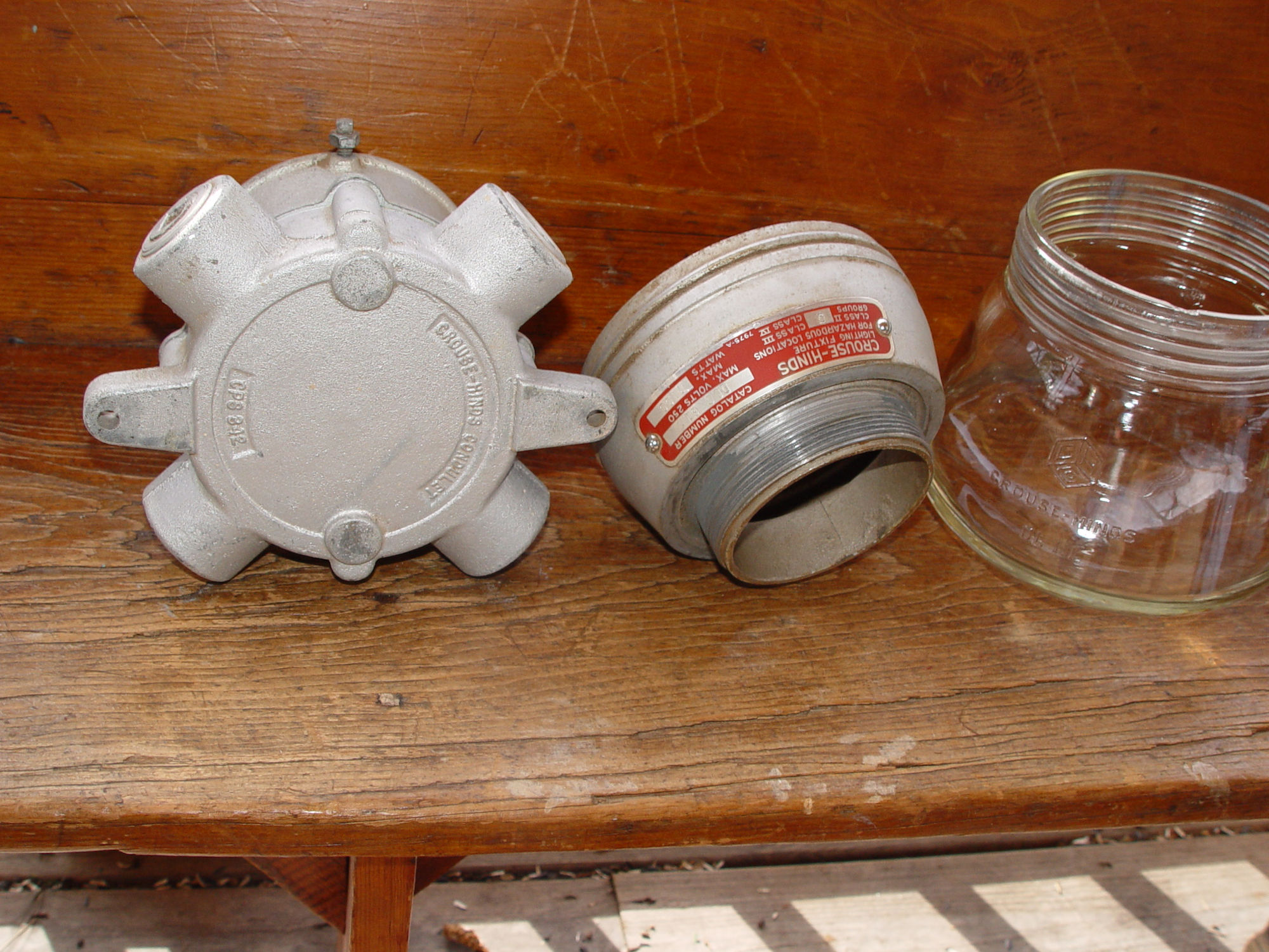 Five vintage Crouse Hinds explosion proof Industrial lights with threaded glass globes. Crouse Hinds is a historical electrical equipment manufacturer founded in 1897.