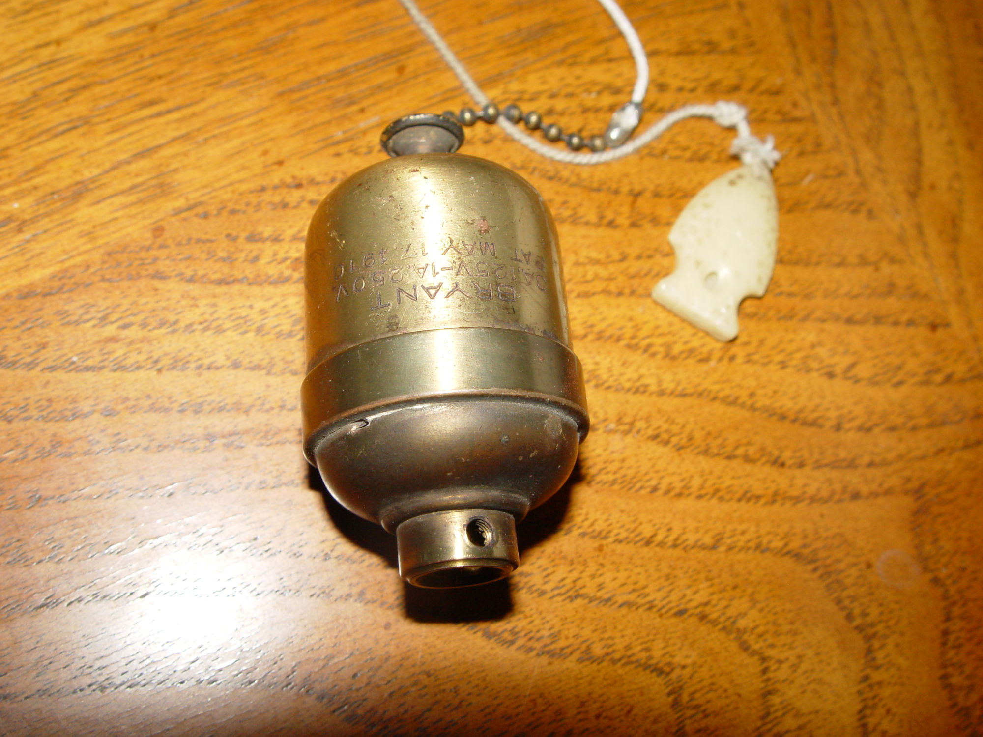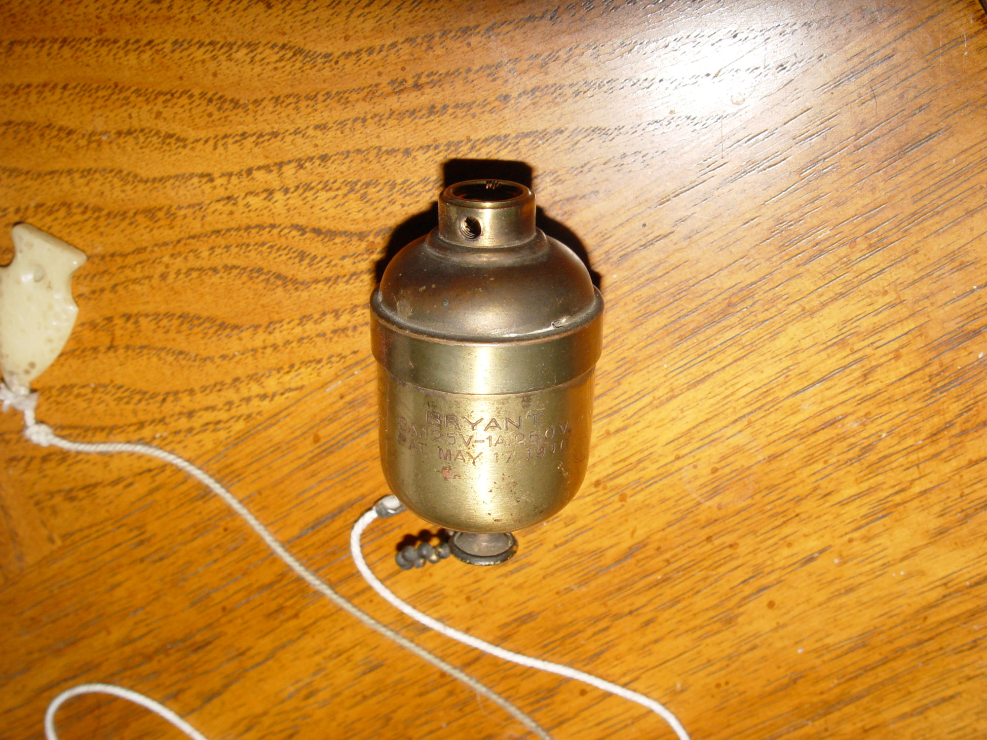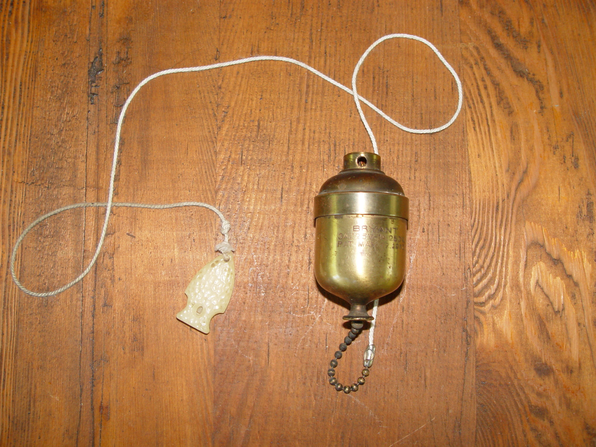 Perfect find for your restoration or steampunk project. Believed to be hard to find. An antique brass Bryant in-line pull chain switch. As found condition, appears to work very well, and was in use in the old home that was torn down.