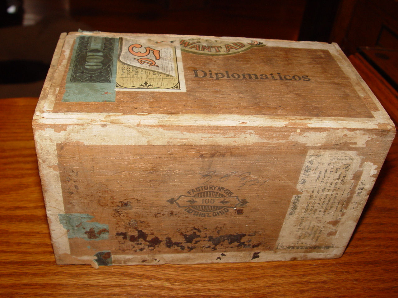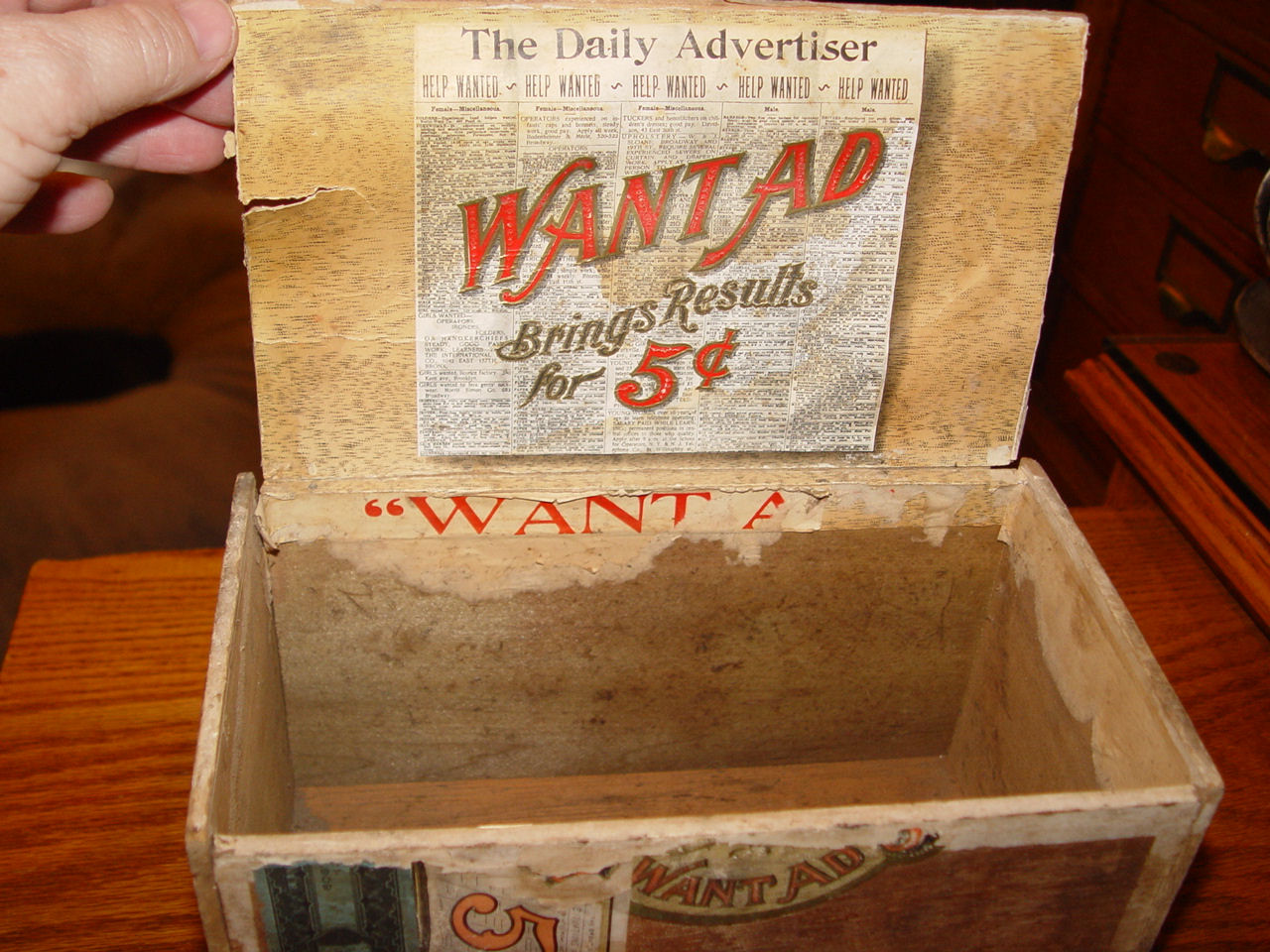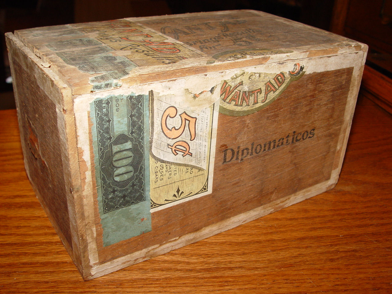 Fun item for the collector. I cannot find another 'Want Ad' box out there. For the age, this piece is very good. Still a lot of original labeling and paper advertising. In black lettering the box shows Diplomaticos,