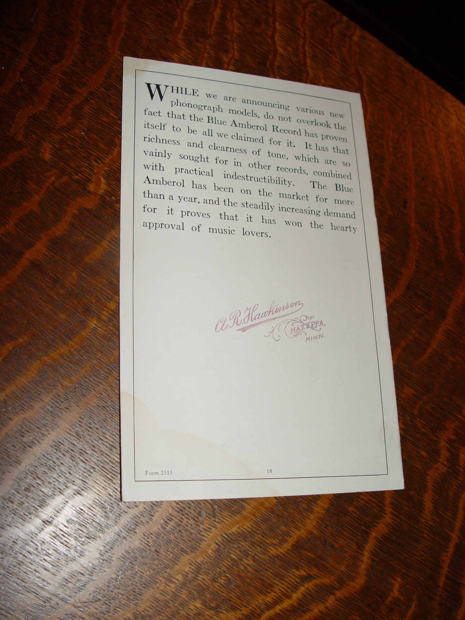 1914 Edison Blue Amberol Records List # 2515 Mazeppa, MN