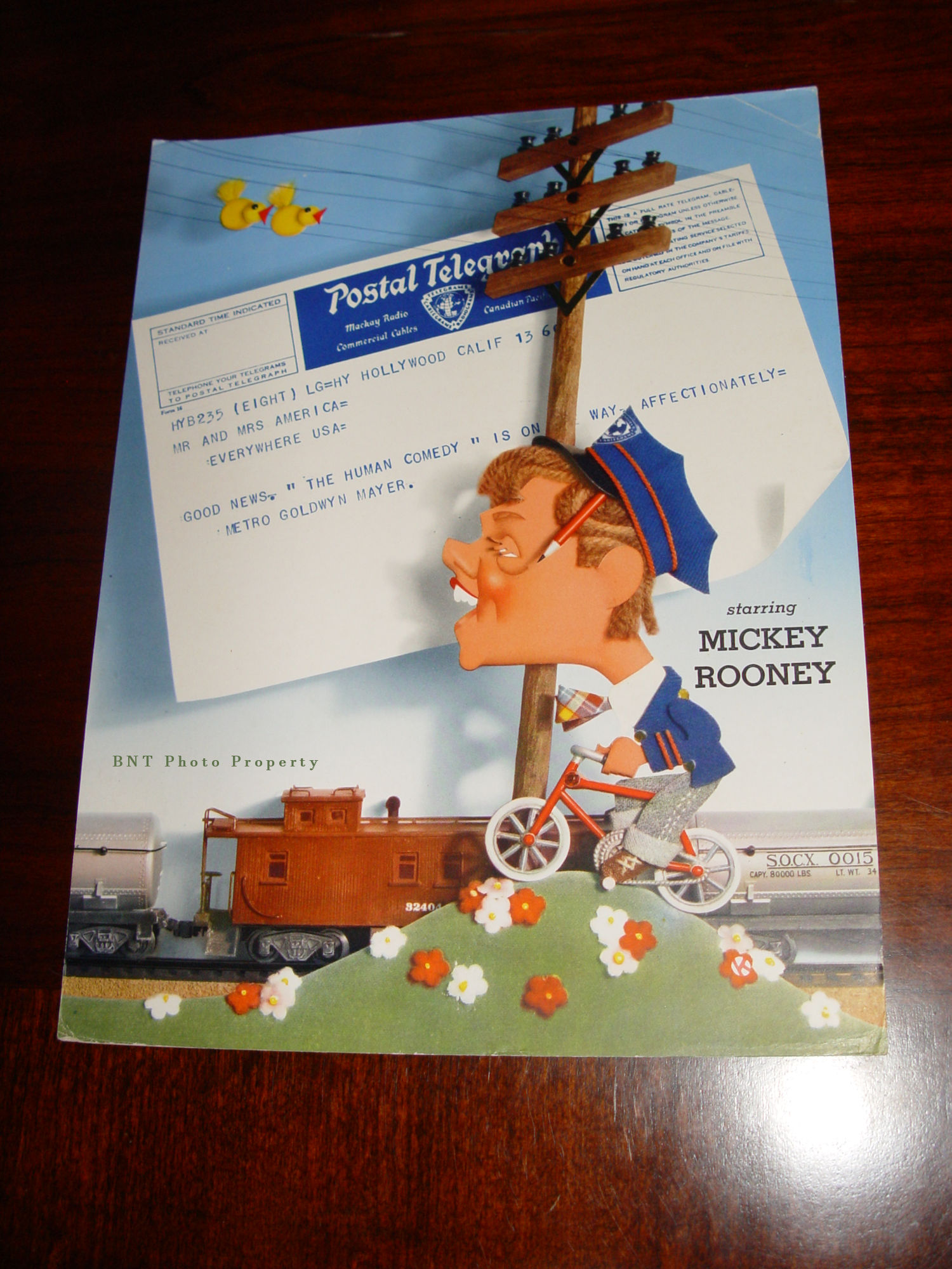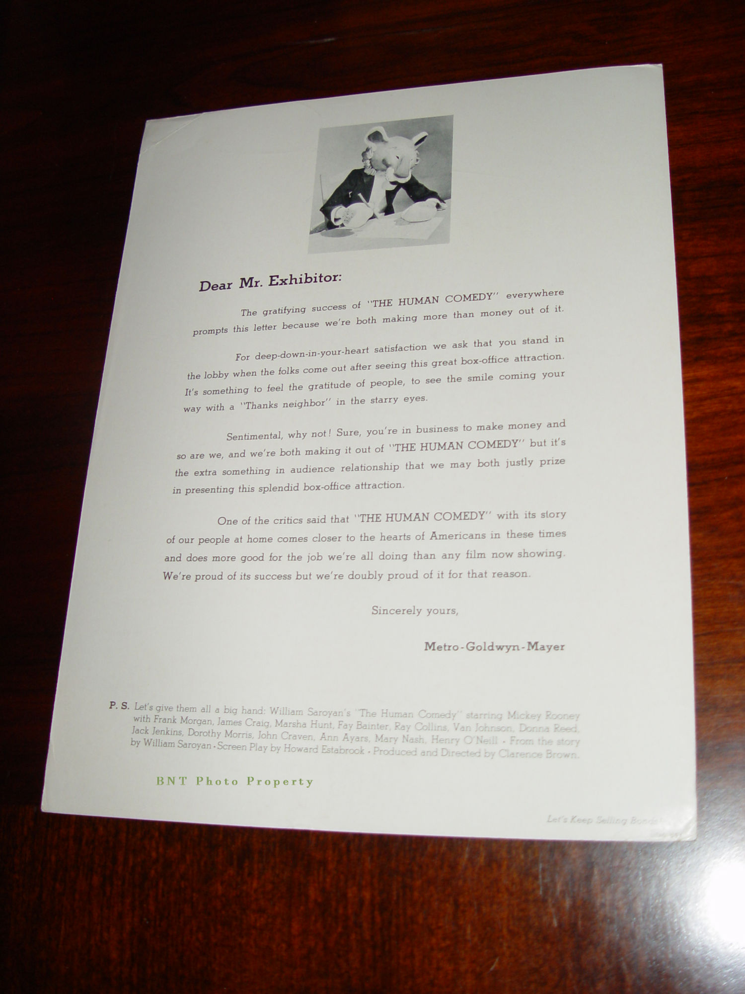 This one is for the 1940's film THE HUMAN COMEDY. Caricature of the actor Mickey Rooney on one side. The other side shows a letter to the Exhibitor, Movie theater from MGM.