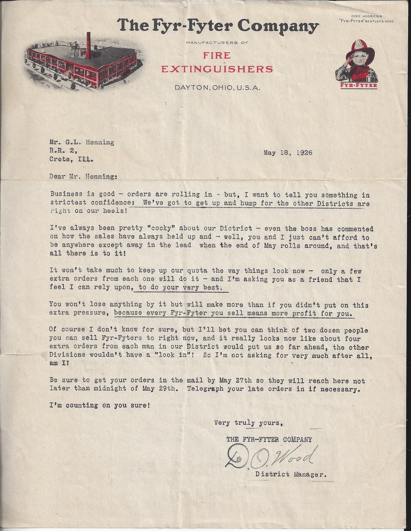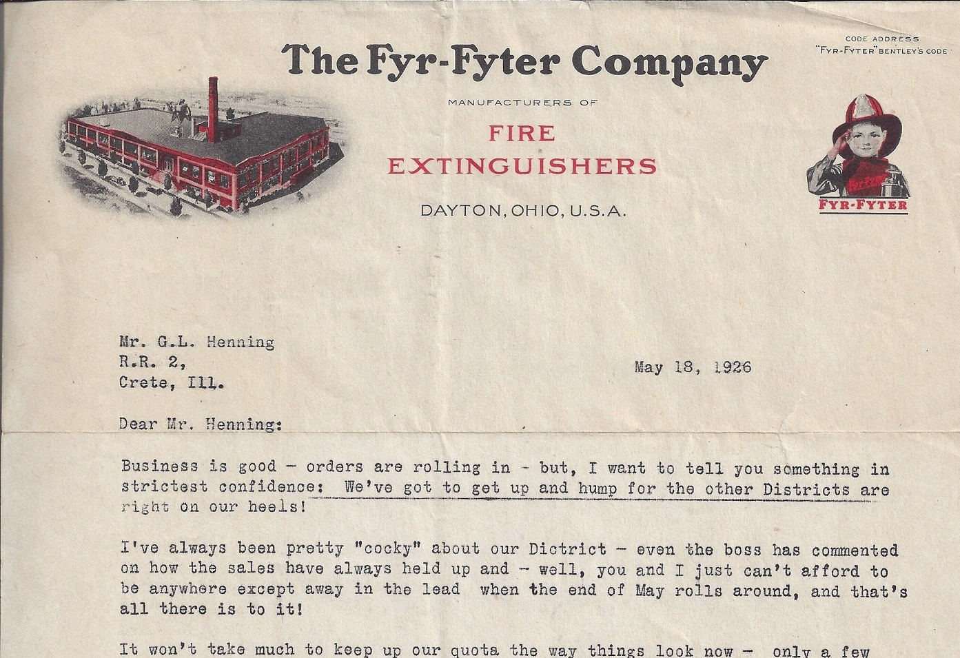 Addressed to a Mr. G. L. Henning of Crete Illinois. Apparently a salesman for the company and getting a booster letter of sorts to sell more extinguishers.