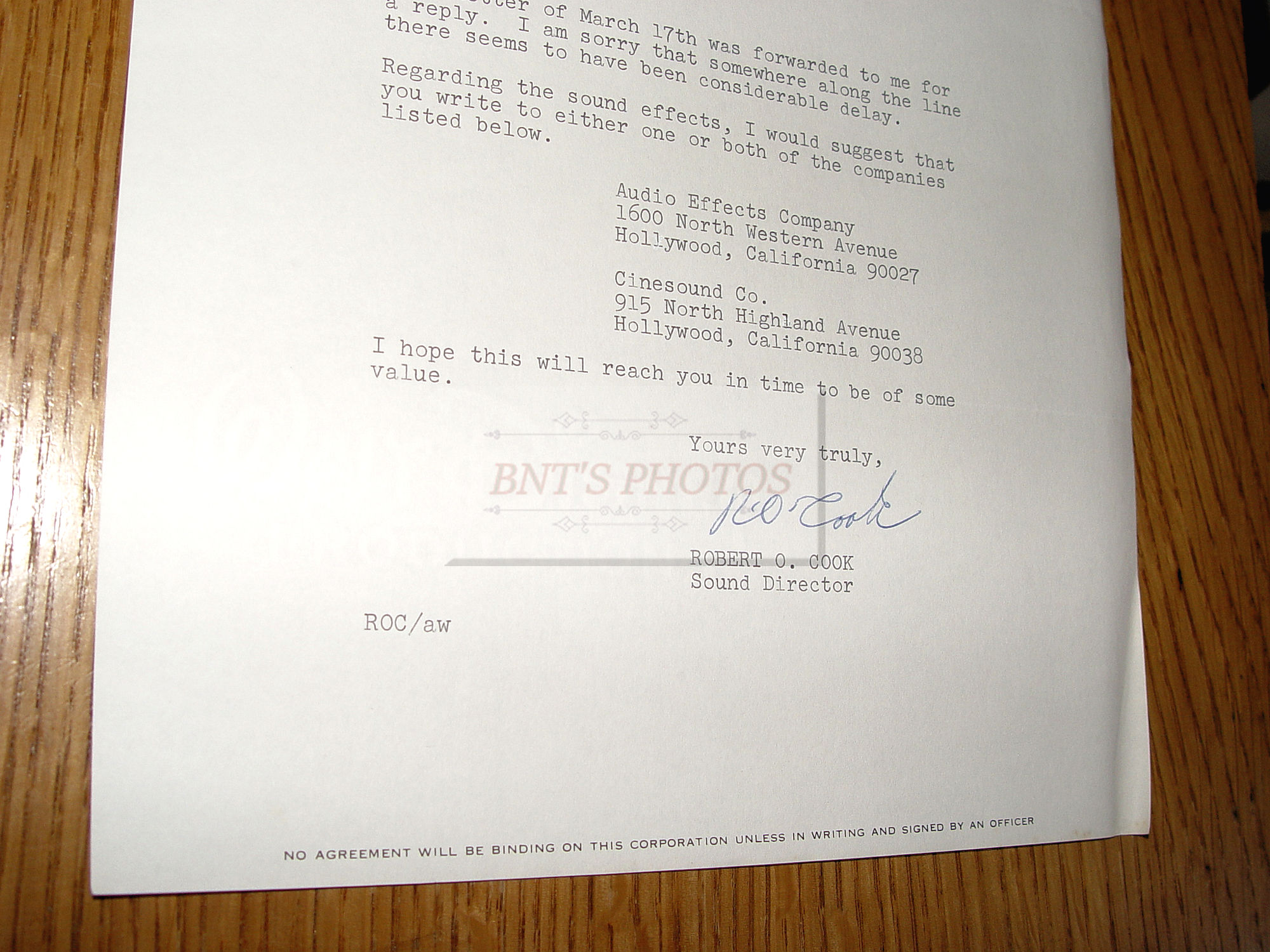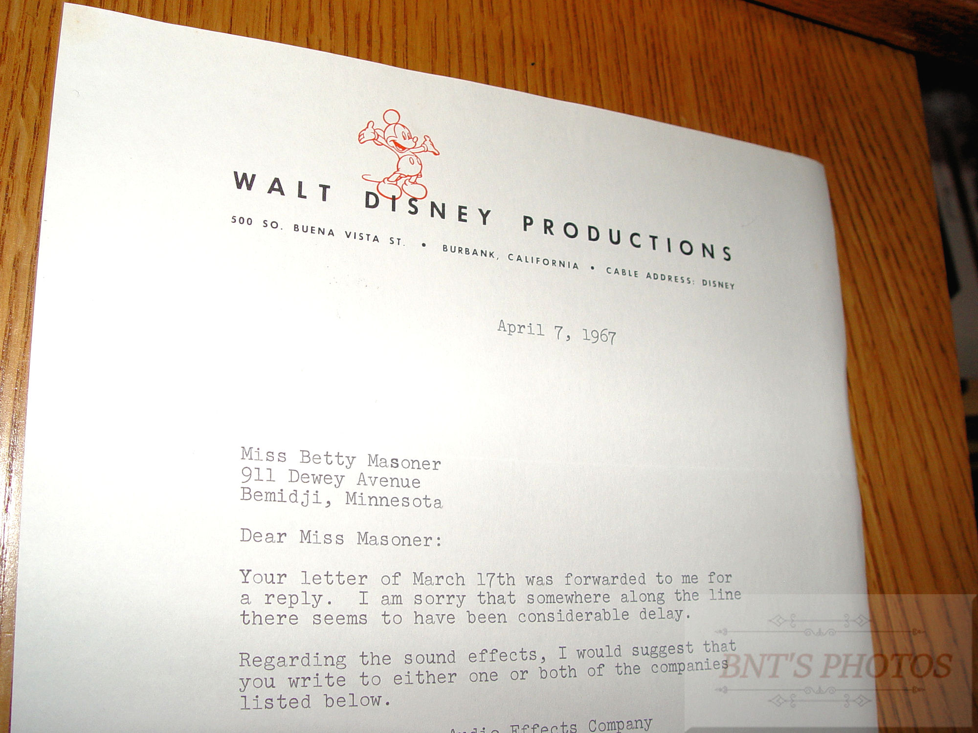 This is the letterhead showing the response from the Sound Director at Disney and signed by Robert O. Cook, (1903 – 1995), finally finding direction to the sound effects she was after. Mr. Cook was an American sound engineer. He was nominated for three Academy Awards in the category Sound Recording. He worked on nearly 100 films between 1946 and 1977. Some of his work ... The Parent Trap (1961), Bon Voyage! (1962) and Mary Poppins (1964). and more.