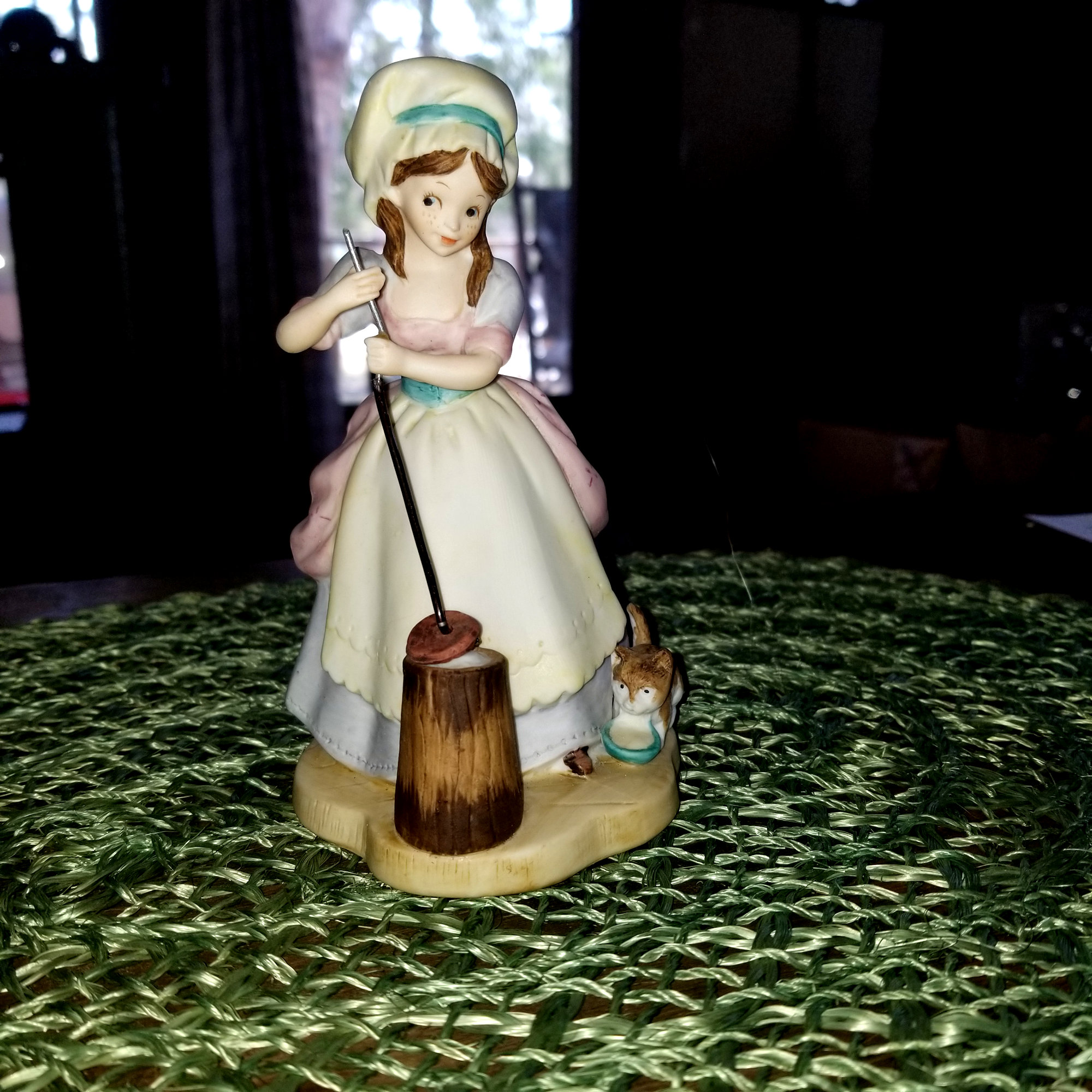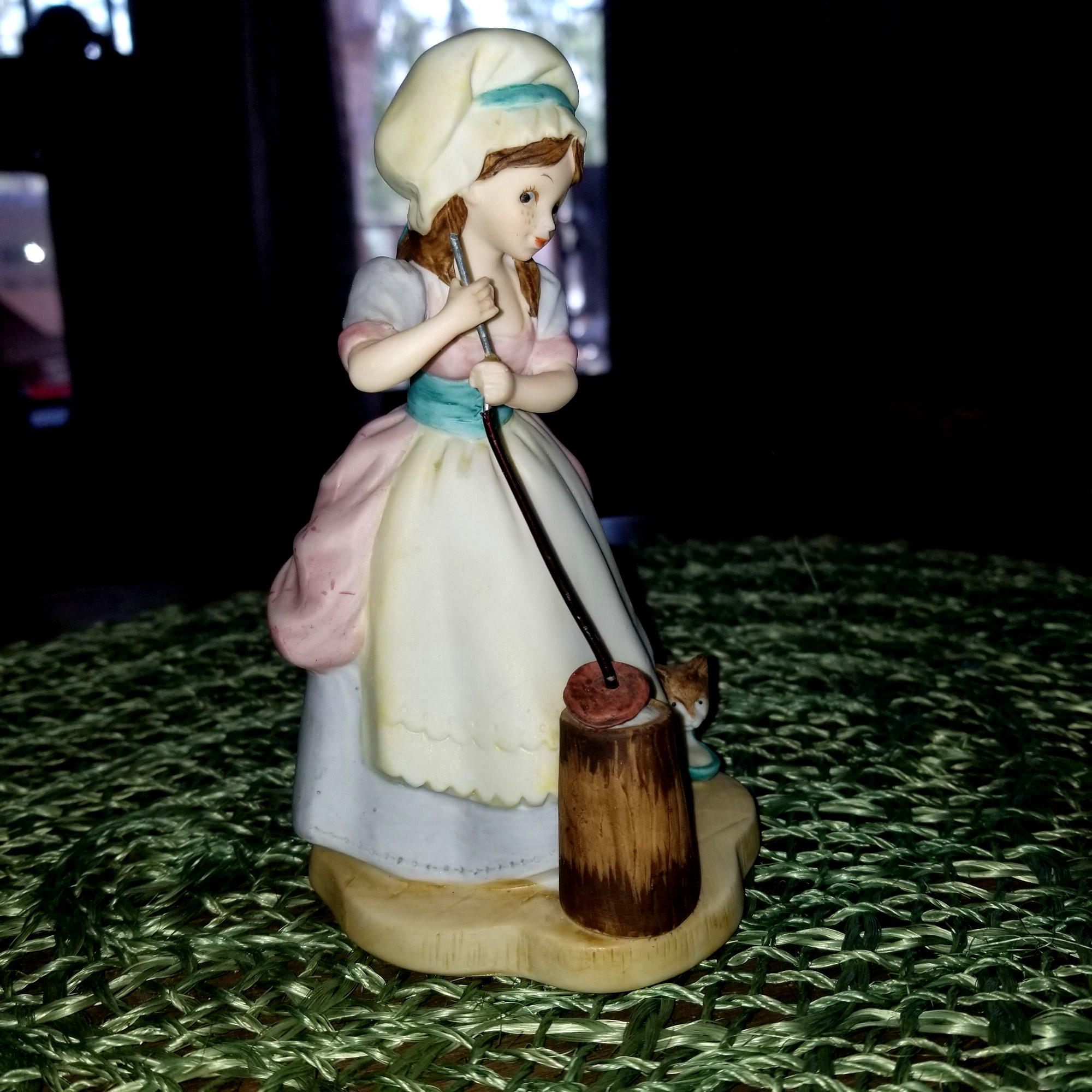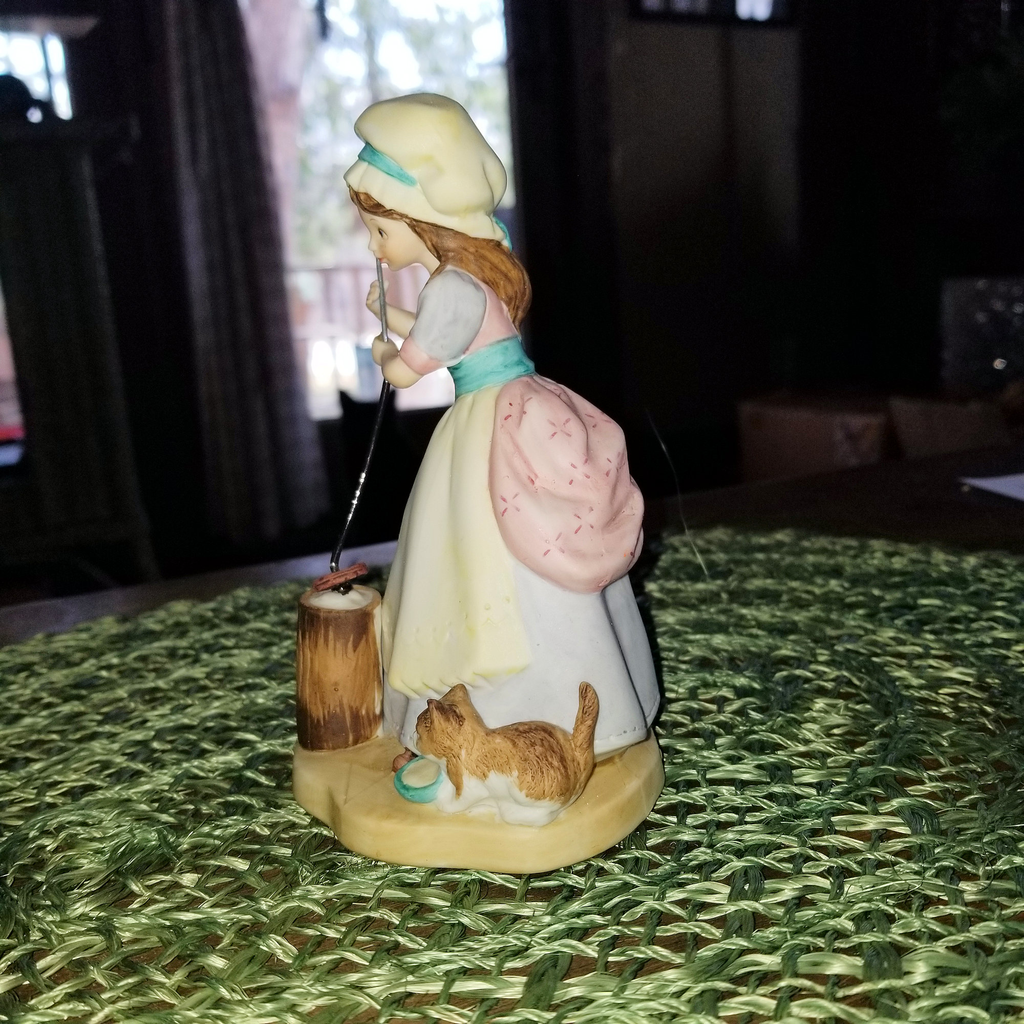 Very pretty brunette country farm girl churning butter with her loving kitten by her side enjoying some cream. Soft tones of browns, pinks, violets and beige on this figurine.