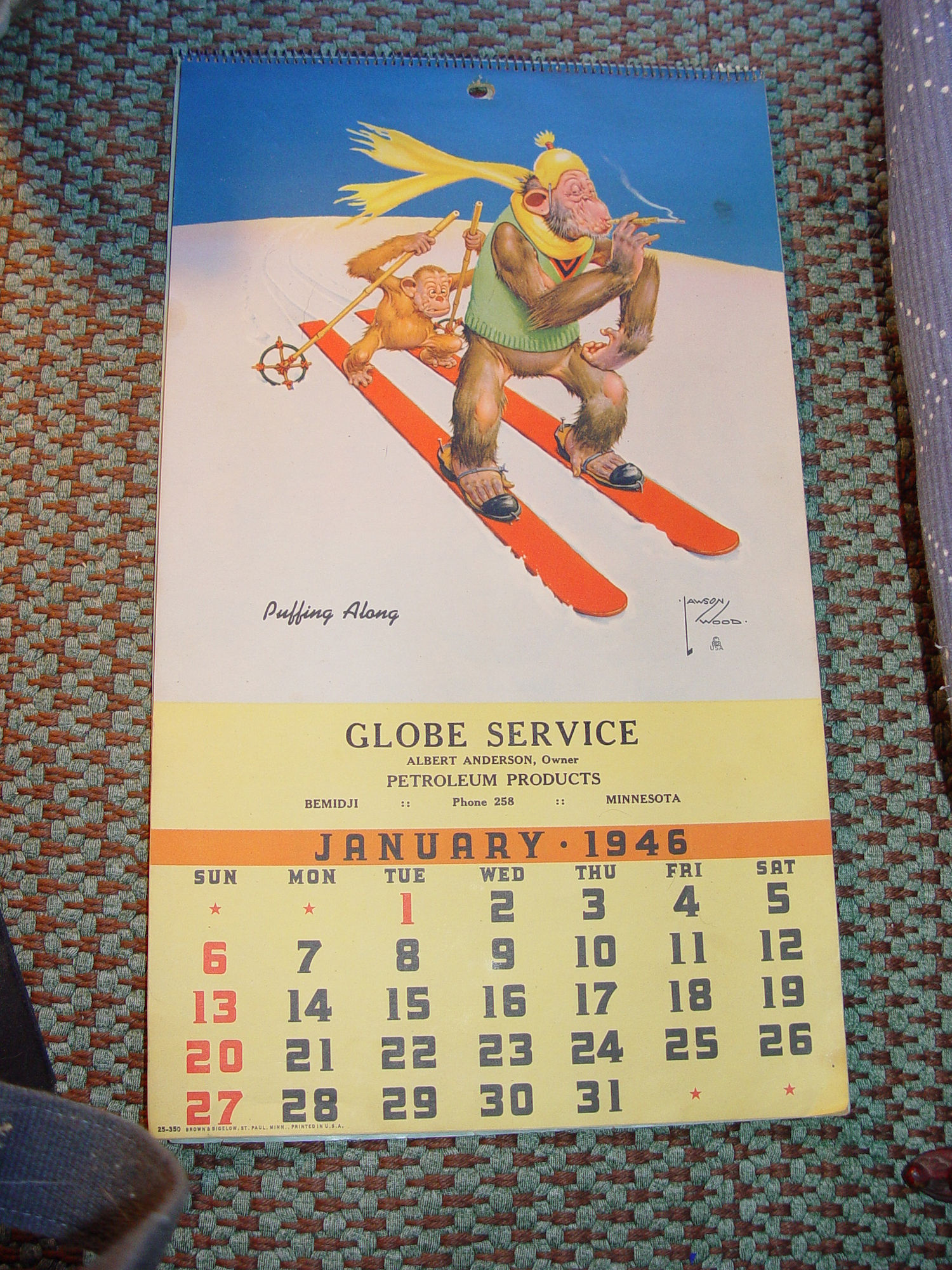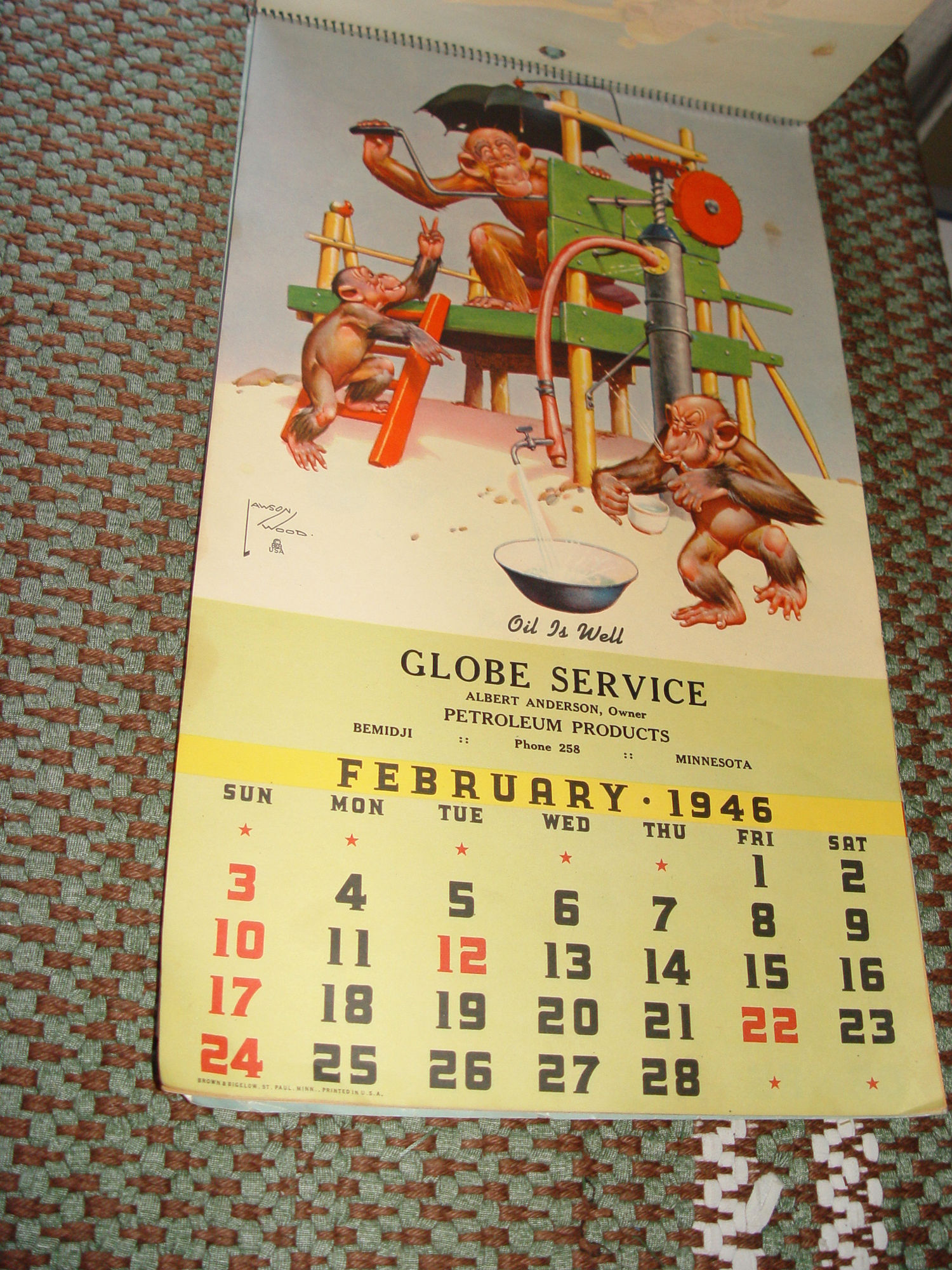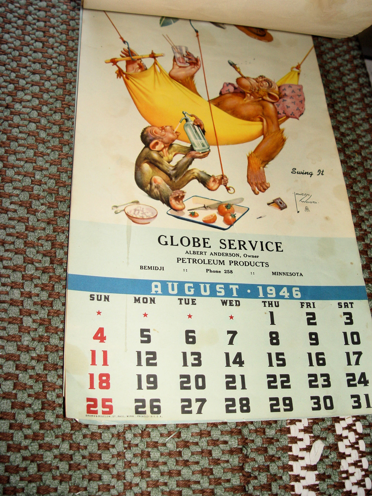 A wonderful and very entertaining large for the year 1946. Lawson Wood wall calendar with Wood's signature monkey comical antics in bright color. The calendar was created for Globe Service station, Albert Anderson, Owner. This was in Bemidji, Minnesota. The calendar was printed by Brown & Bigelow.