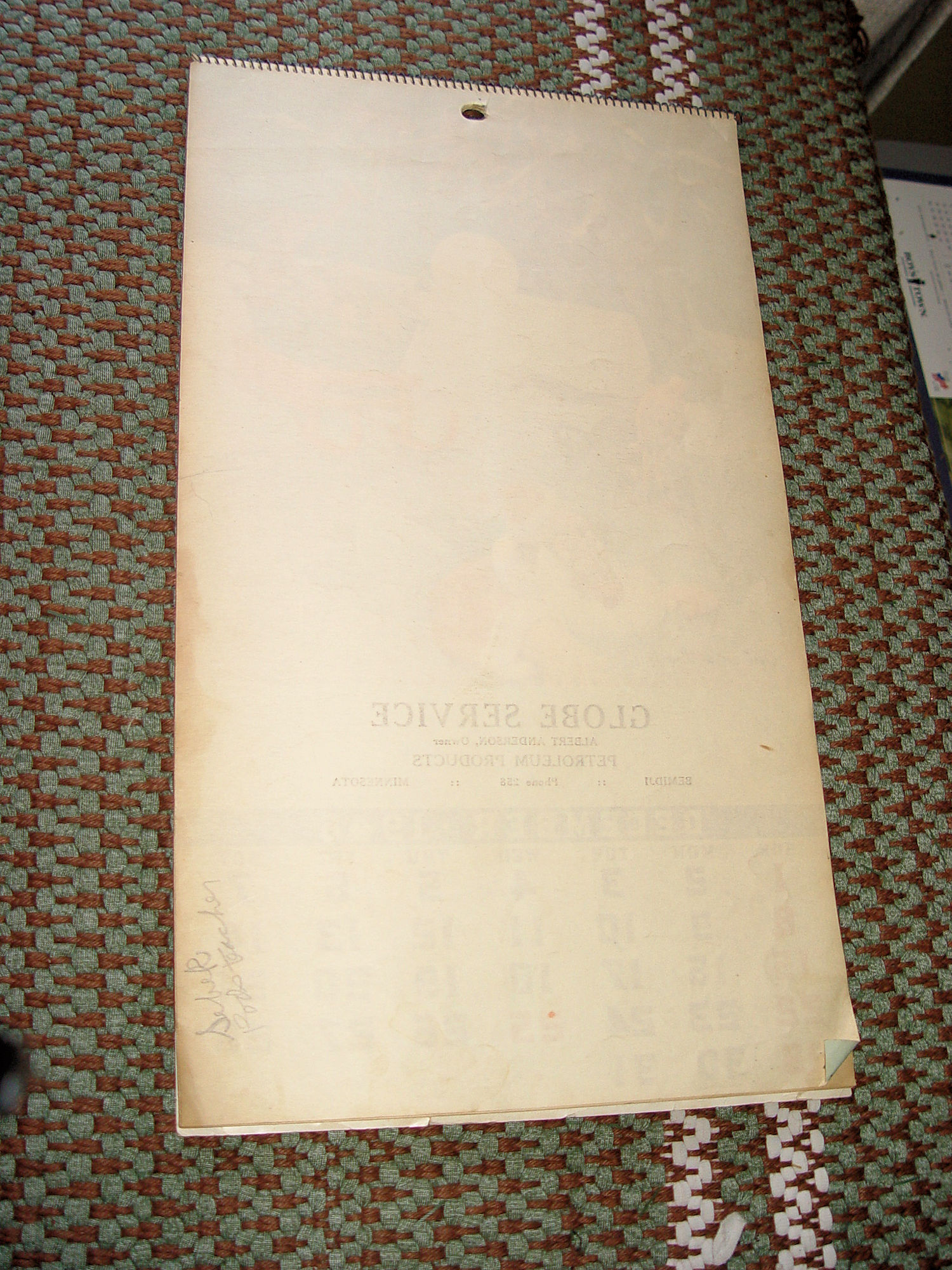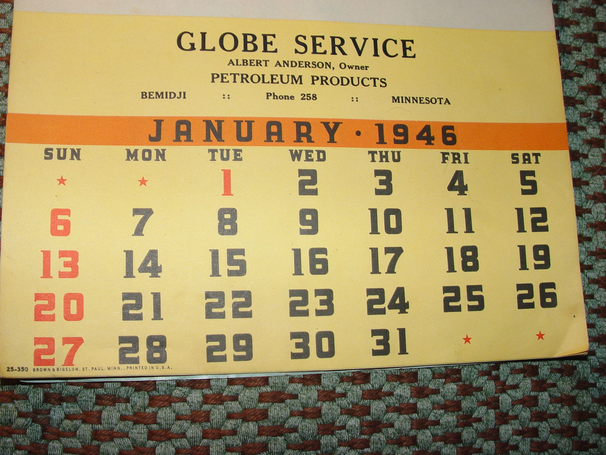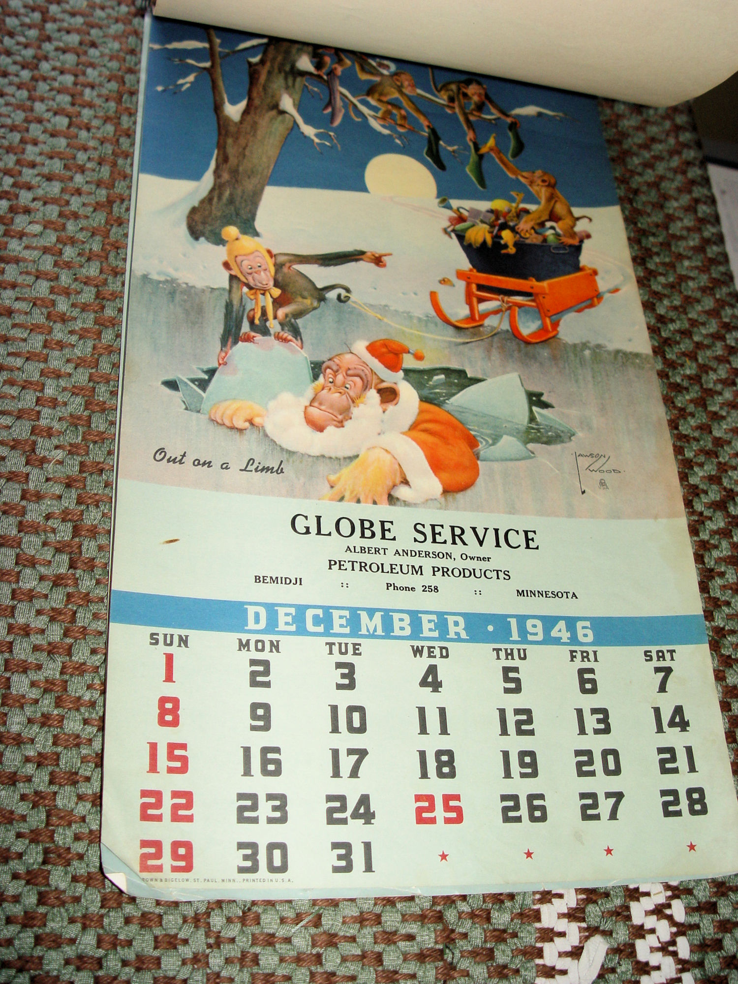 A wonderful and very entertaining large for the year 1946. Lawson Wood wall calendar with Wood's signature monkey comical antics in bright color. The calendar was created for Globe Service station, Albert Anderson, Owner. This was in Bemidji, Minnesota. The calendar was printed by Brown & Bigelow.