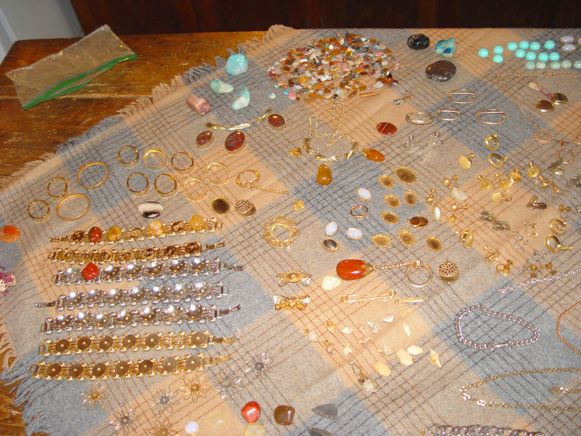 As found in old jewelry maker's estate, cut stones, polished stones, gold toned and silver toned, some may be actual gold...not sure as not my forte. Pretty colored gems and rocks. Rhinestones, opal and turquoise looking gems (again, do not know if real or not). There are many bezels, settings, earring studs, necklace chains, bracelets of many styles and shapes. I'm hoping that professionals and hobbyist will recognize from the photos what is here. Easily over 100 pieces, too many to count. These will be bagged and container packaged carefully for the new owner. All that you see here is for this sale.