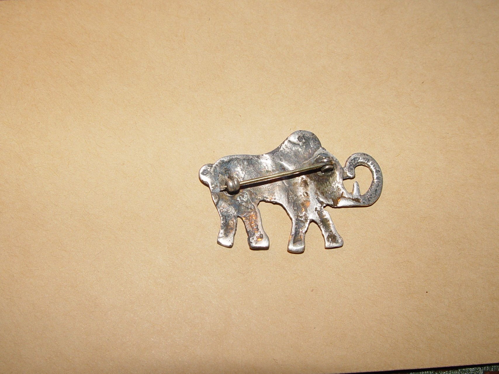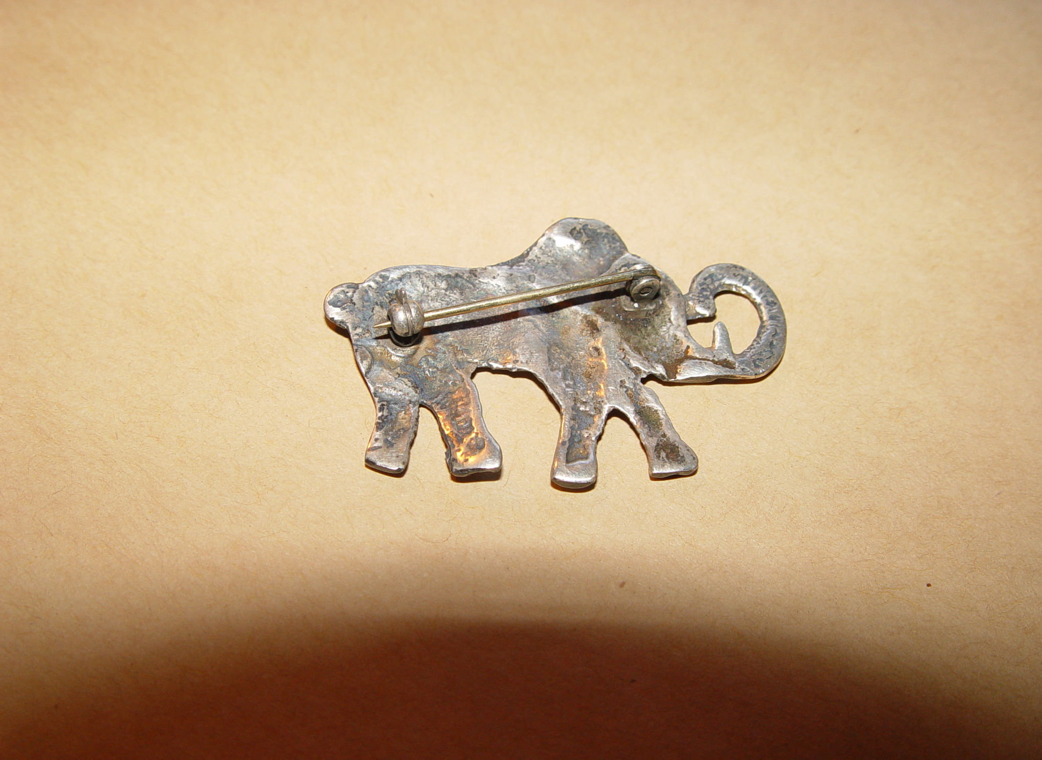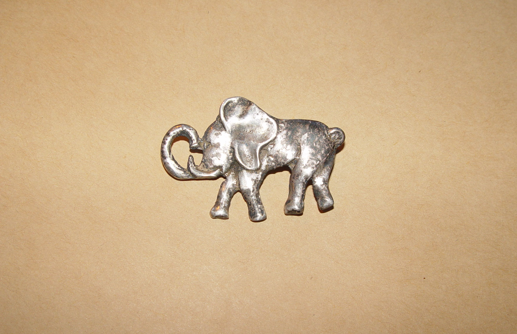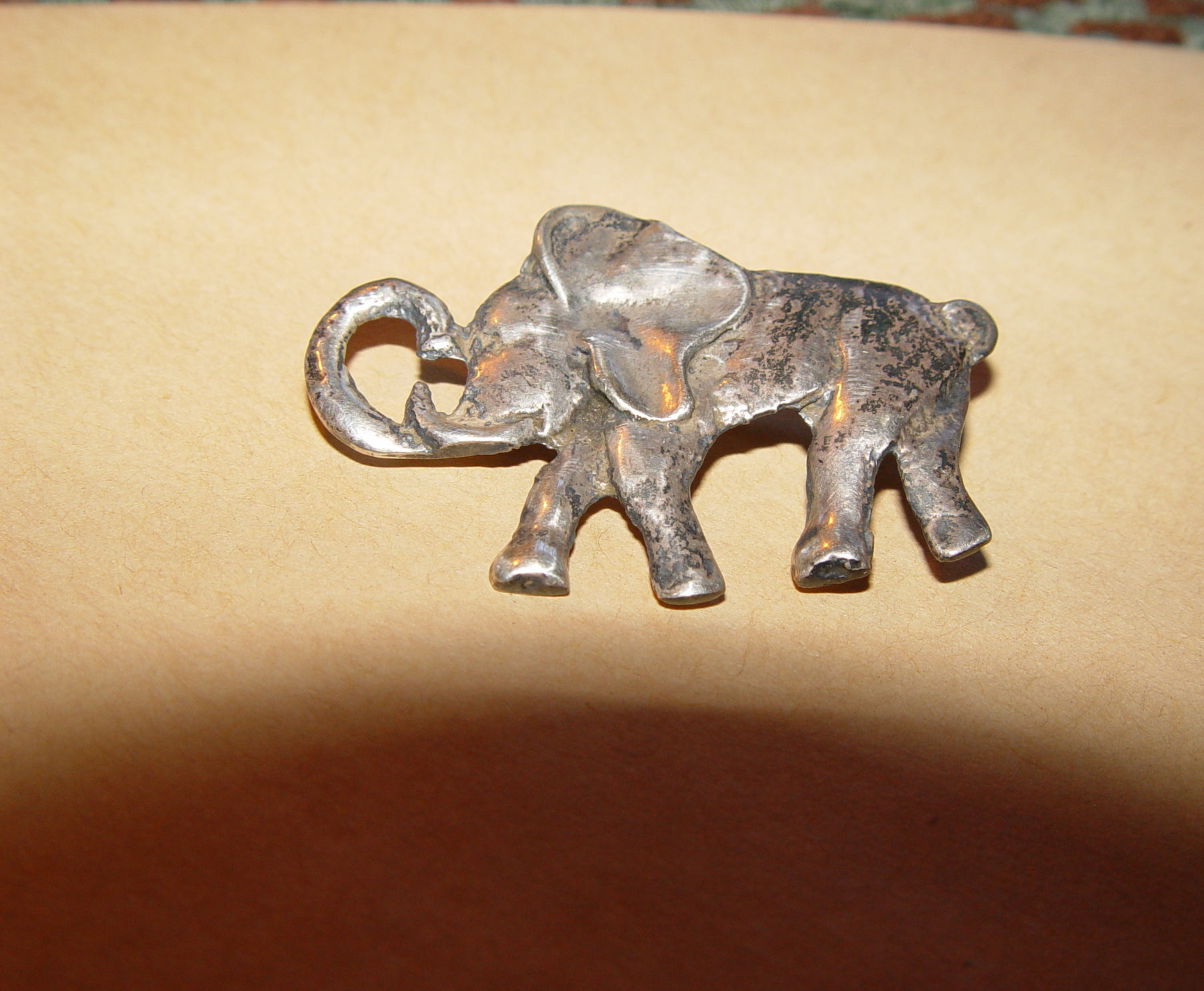 Vintage small Elephant with his tusk up. Believe this means the little guy will bring you good luck. Sterling silver. Rough cast but believe it is marked backside of trunk. Measures approx. 2" long by 1.5" tall.