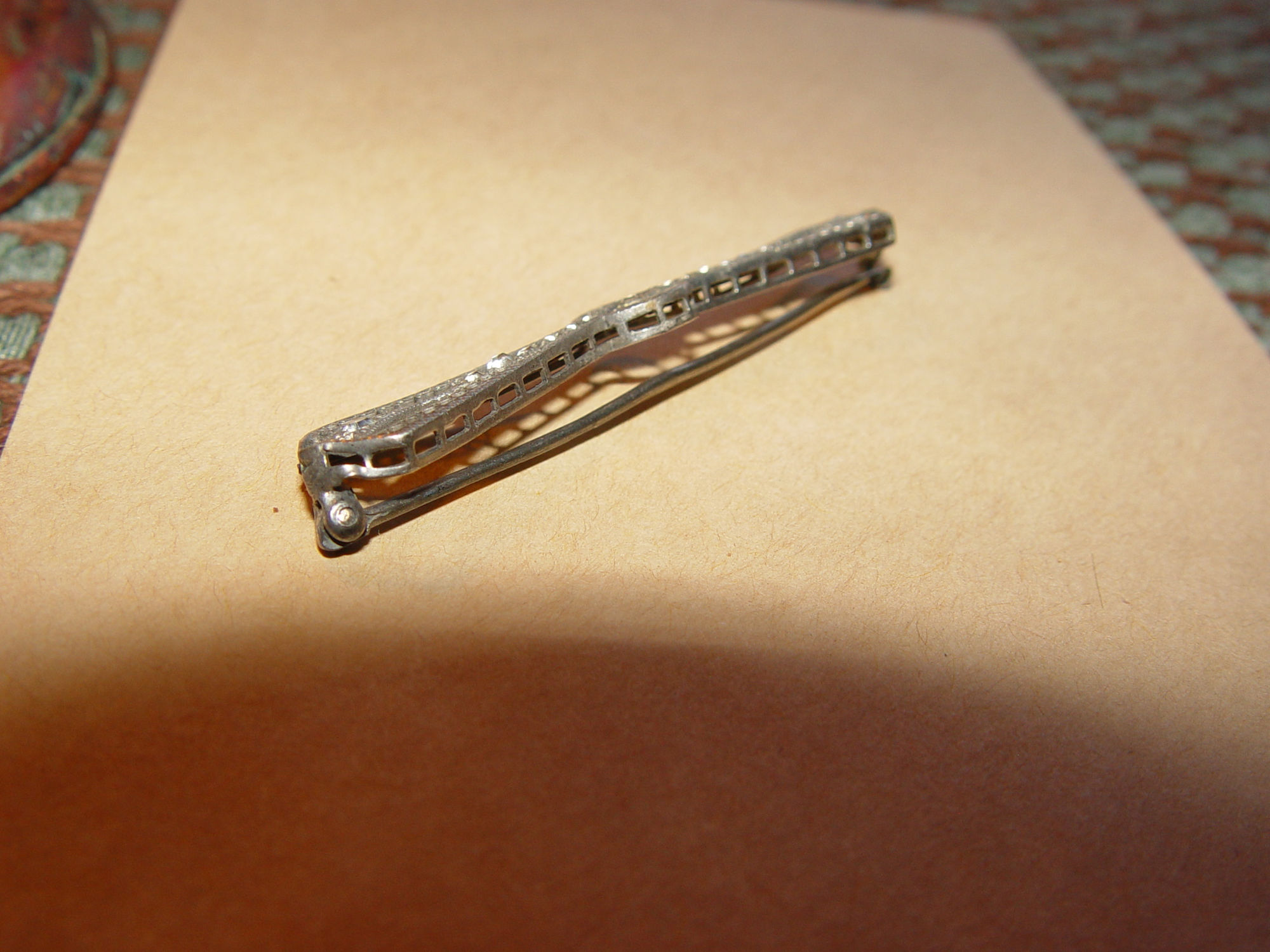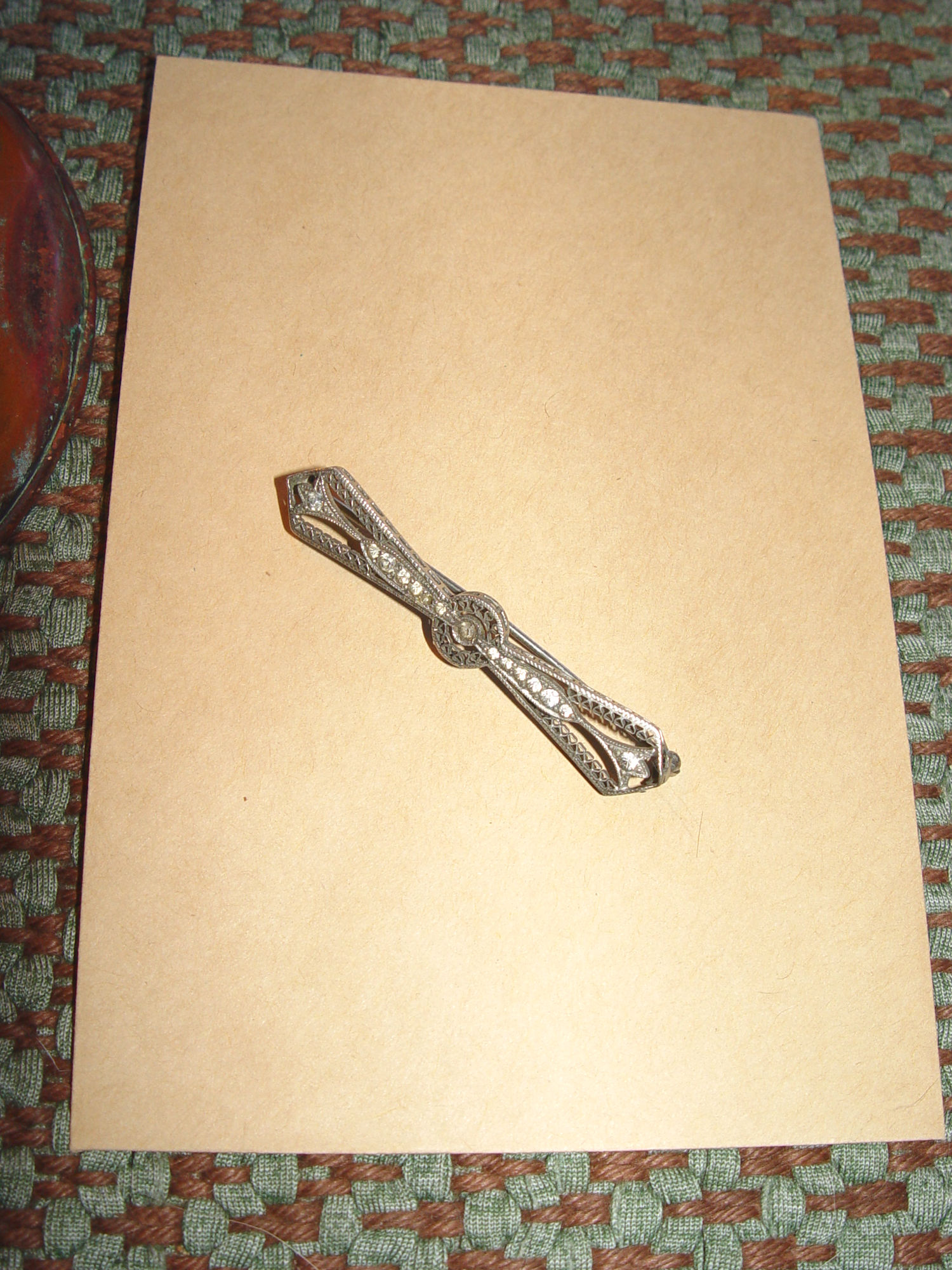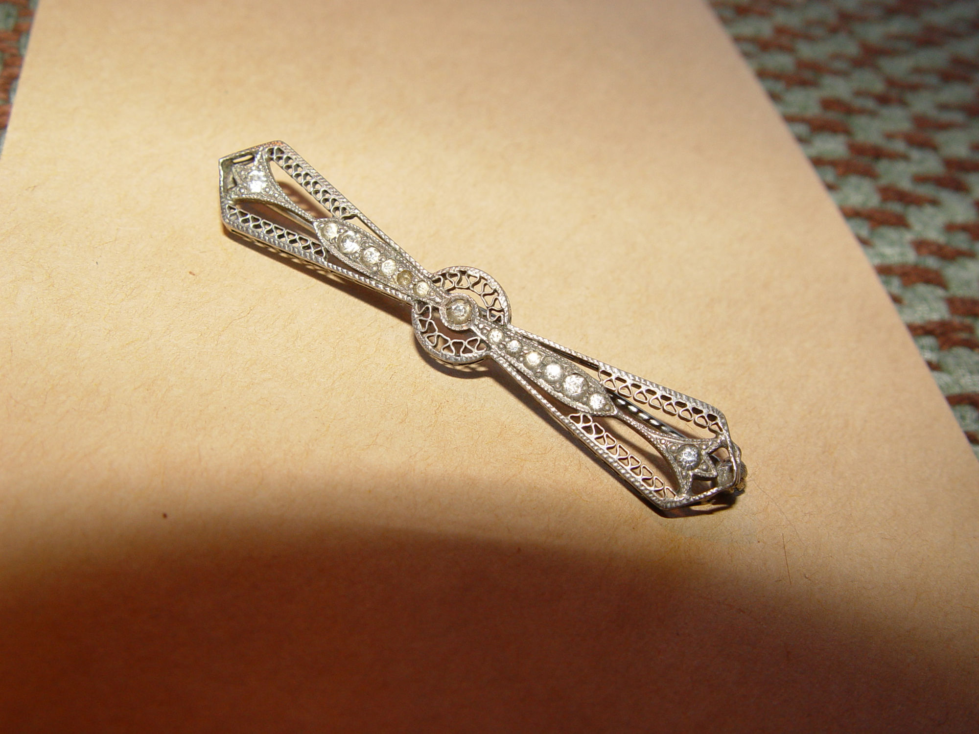 Beautiful Edwardian filigree bar brooch made of Sterling Silver. This is a special piece, as found in a pin collectors estate. Full of detail and set with 14 faceted gemstones, (one is missing) should be 15.