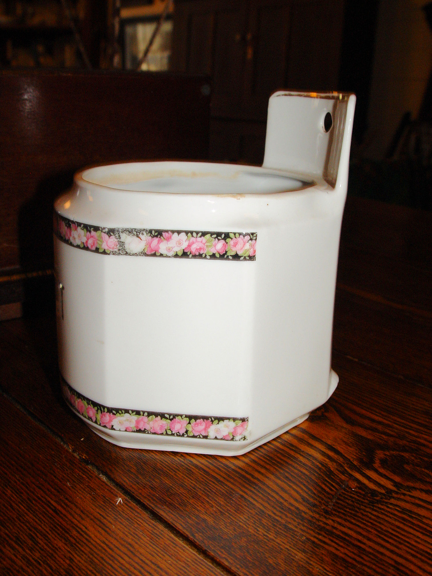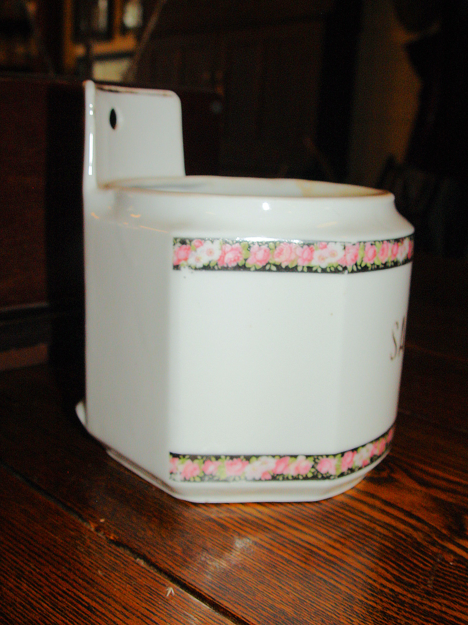 Pretty antique SALT BOX with chintz decorated borders. Made in Germany, this porcelain salt box can sit on a counter of hang on your wall.