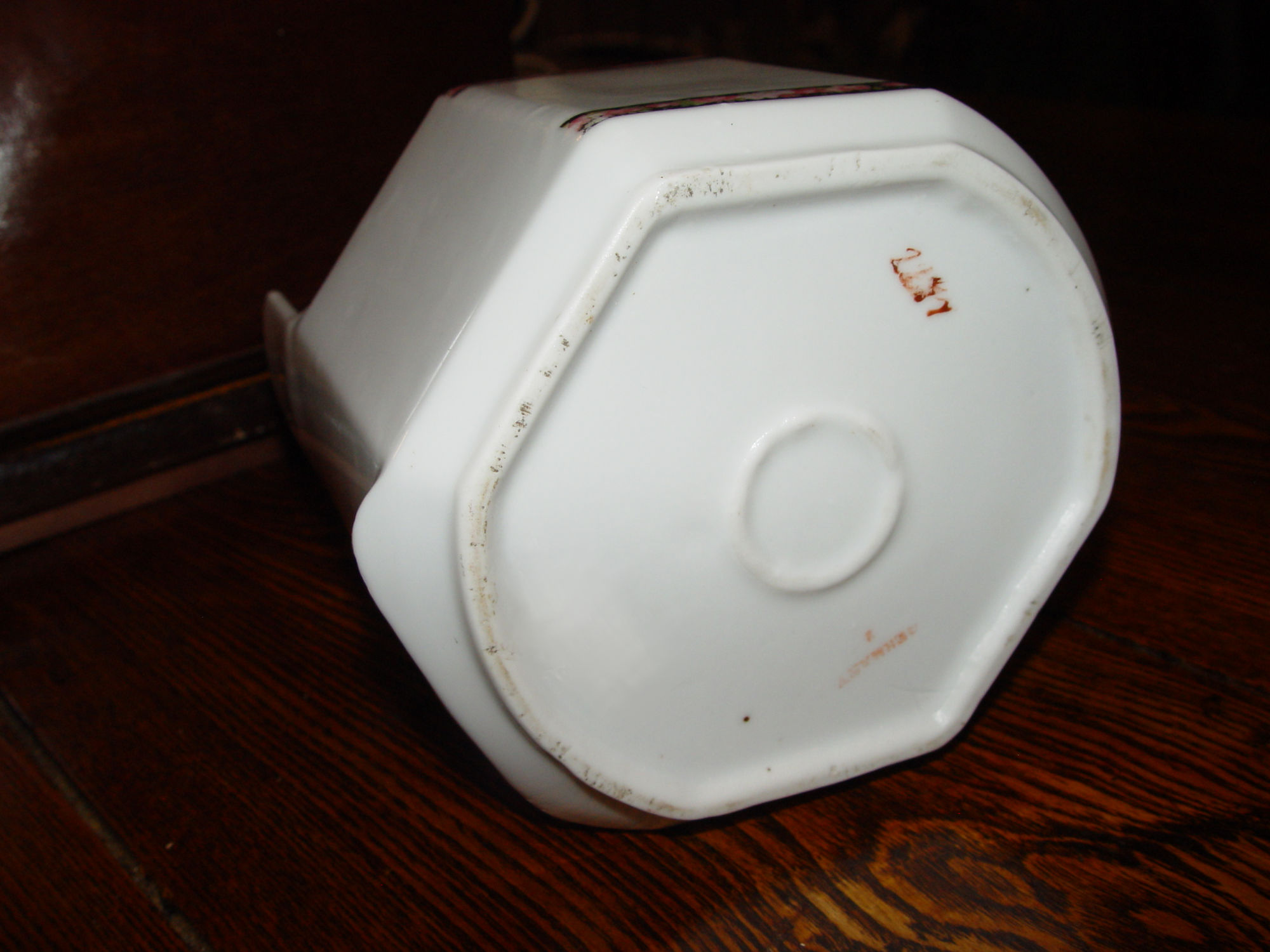 Its all original and in very nice condition, the gold accents and the word Salt are rubbed still there so that is a nice plus. This particular Salt never had a lid. There are no holes for attaching one.