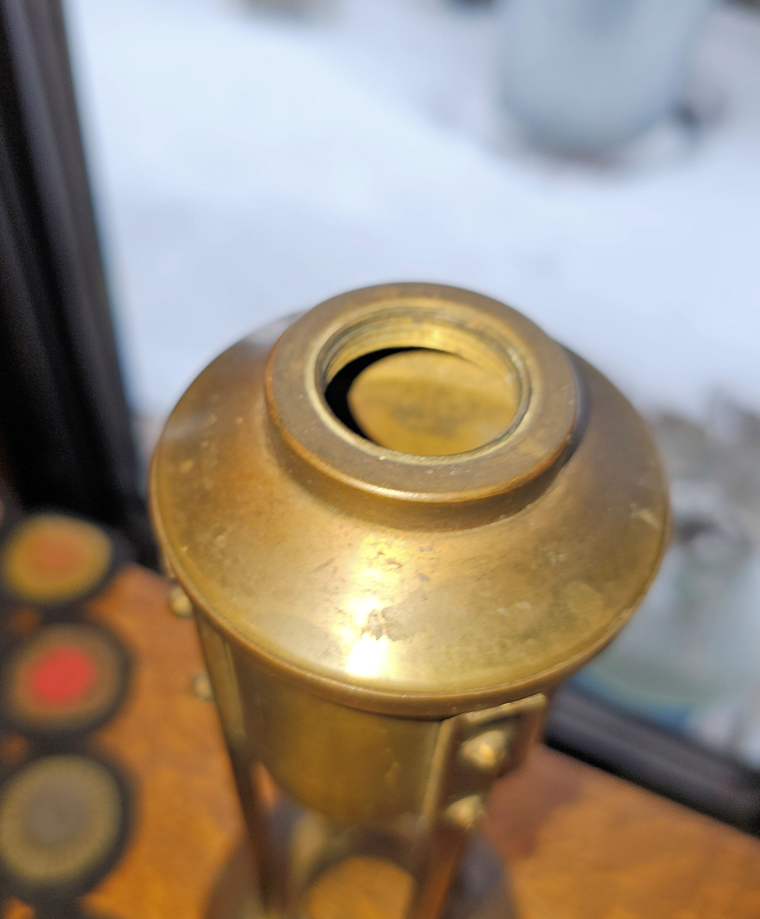 This has been in my collection for years. I can't find another out there so purly guessing on whether it is a Naval, miner or railroad oil lamp but there is a font and threads ....surely held a cylinder glass of sorts. Made of brass and very unique. Hoping someone out there knows of this and can help out.