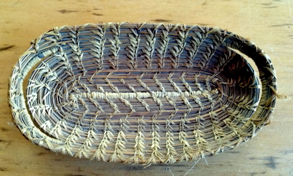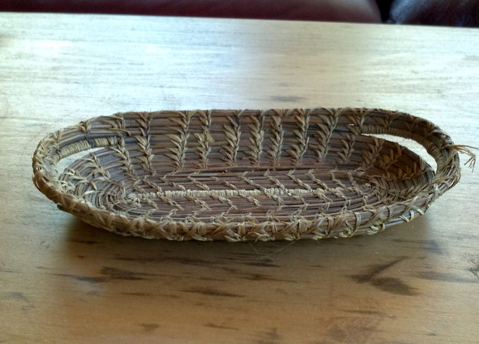 A small Papago medicine or trinket tray basket. It is very solid and well made. It's made from yucca and grass. This tribe as other's are known for their beautiful and intricate baskets and weaving. There is a small breakage in the grass wrap on one end, very small. Not to be confused with the handle openings. See photos.