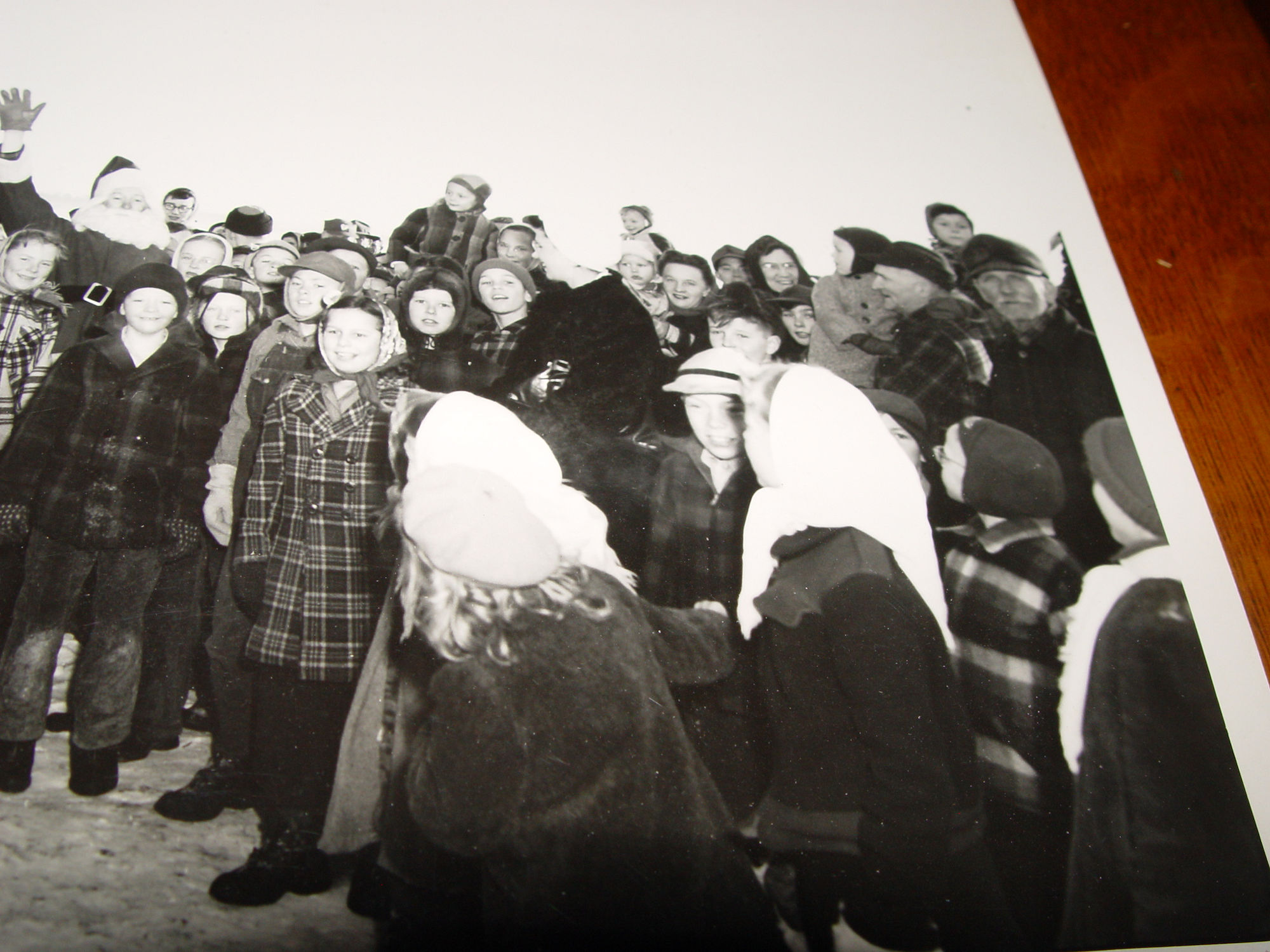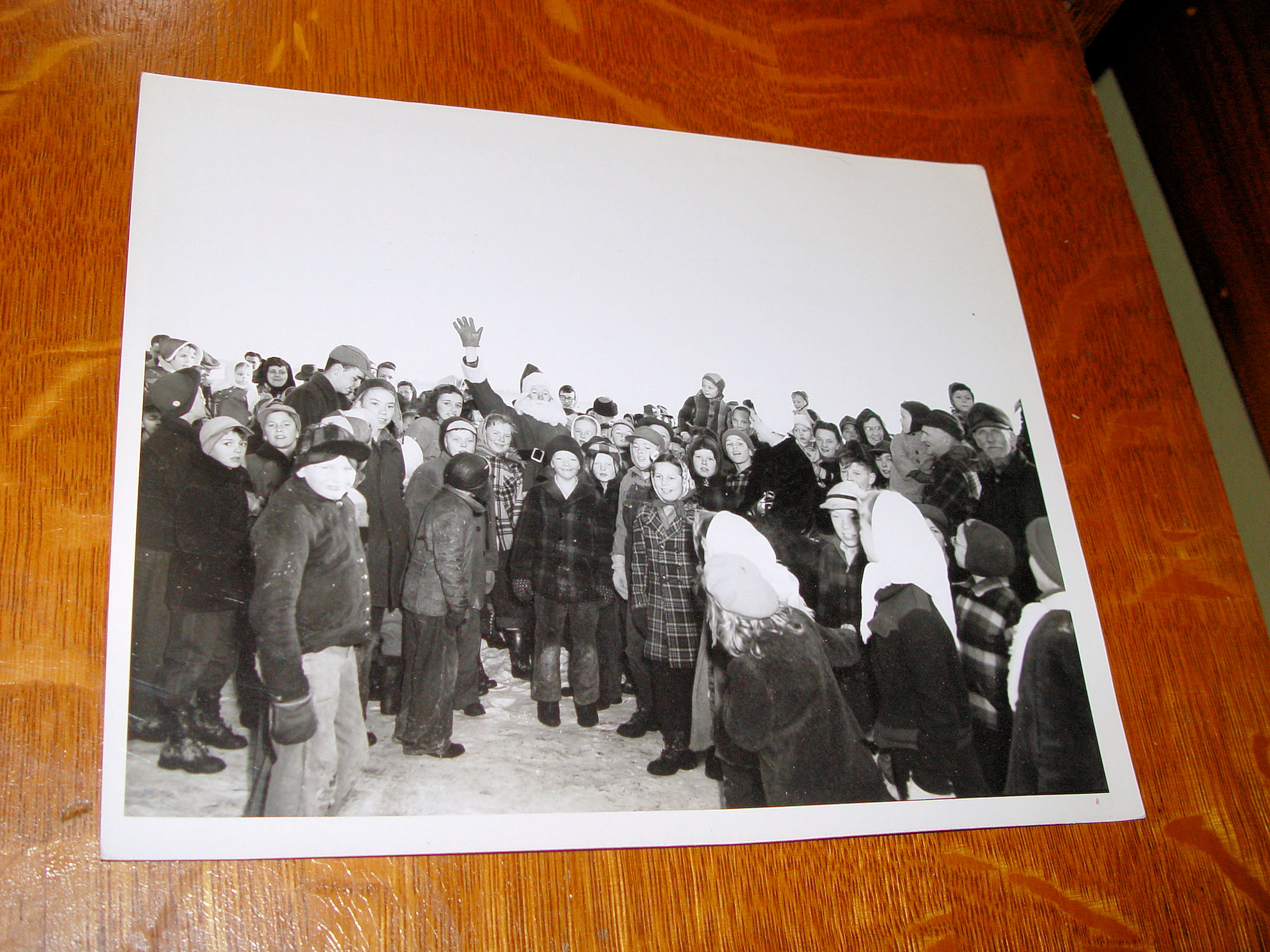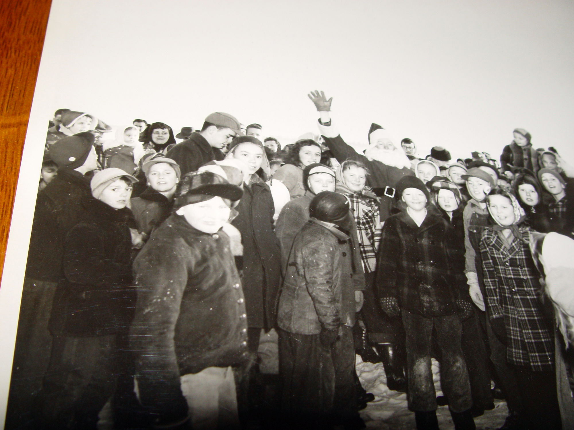 and adults in wool warm coats, hats and mittens. Santa is waving