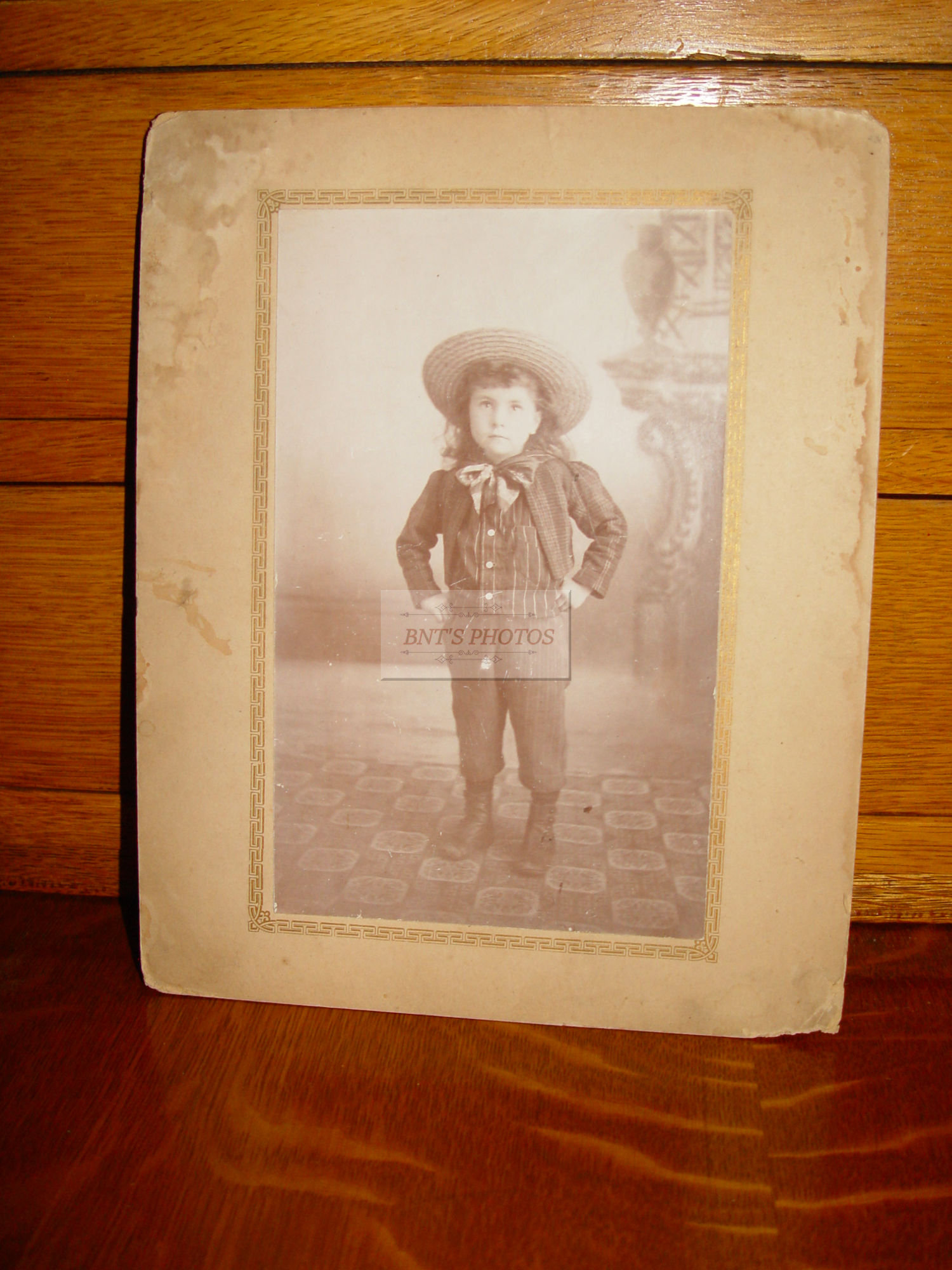 This cabinet card photograph features an adorable little boy? (long hair was customary), who is very stylish in his straw hat, striped jacket, vest and dungarees. Sporting a large fluffy bow tie to boot. Button up shoes finish his outfit. This is a studio portrait dating to approx. turn of the last century. The little guy has his hands on his hips to show confidence ... or defiance. Probably would rather be out playing.
