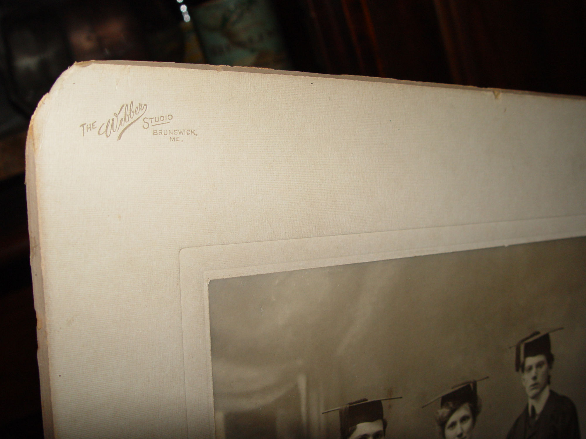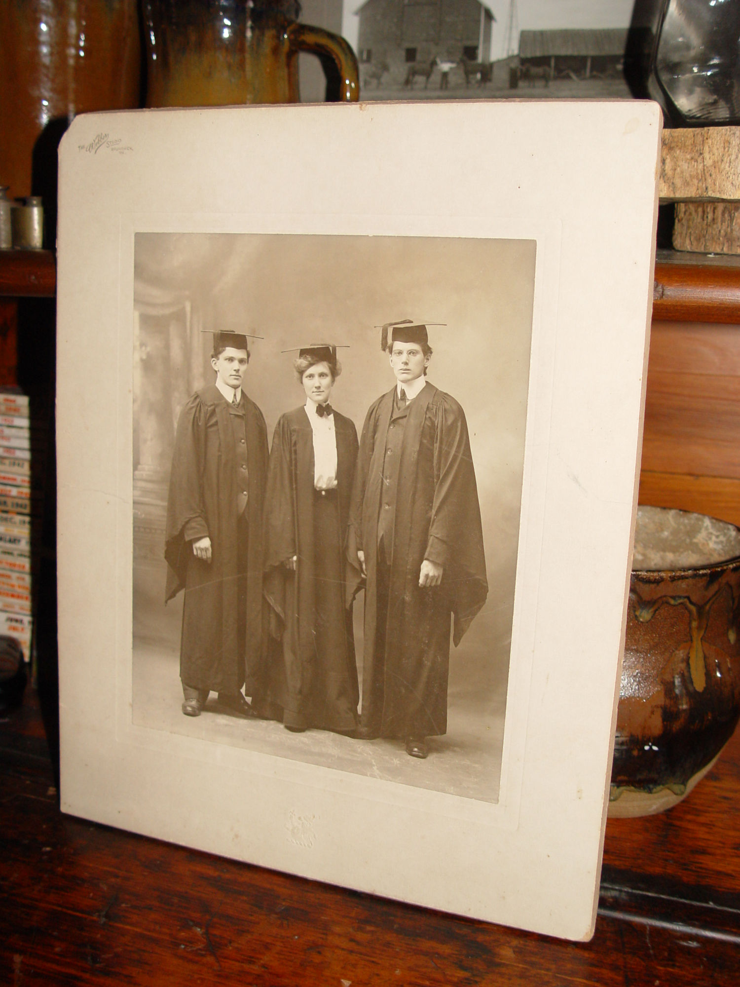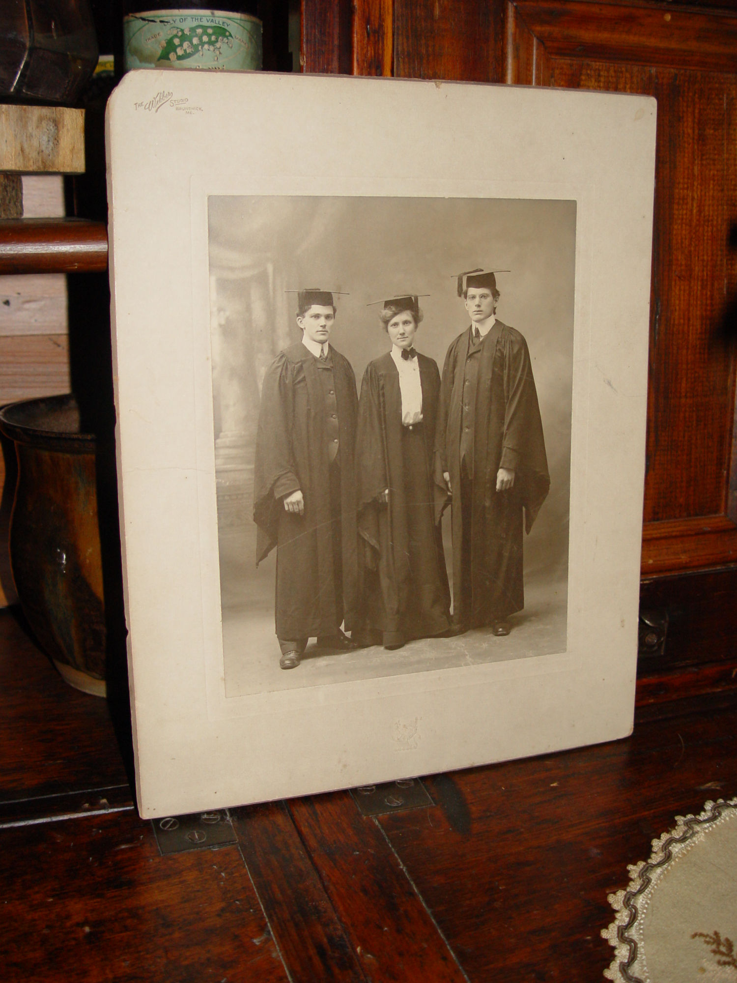 This is perhaps some ivy league graduates from the well known Bowdoin College in Brunswick, Maine. The photographer is in the upper left corner - The Webber Studio. Heavy board cabinet photo with the photograph of the three student's. Believed to be dating to the first of the last century. Very good condition with the board showing minor signs of age and wear due to age, photograph is very nice. The back is soiled and shows the most wear. Has been stored for years in with other photos, estate purchase. No names or markings.