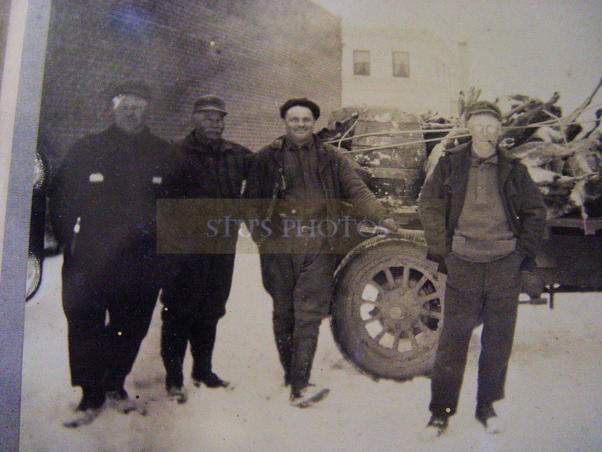 Early original photograph of men on a day of successful hunting. Perhaps a deer for every hunter. Believe these men about town are standing next to a C Cab one ton truck. There is a large wooden barrel in the back of the truck and maybe old tarps.