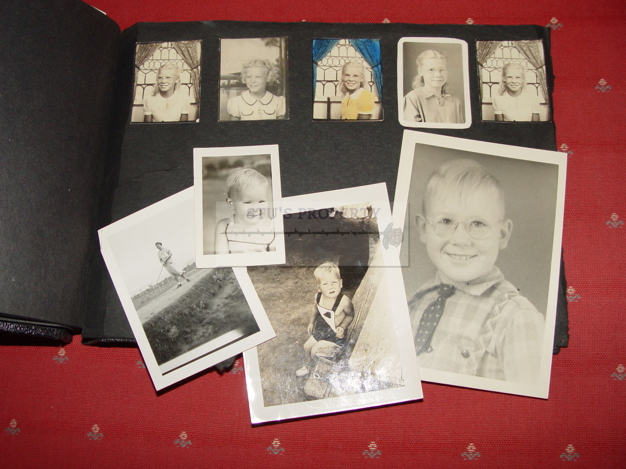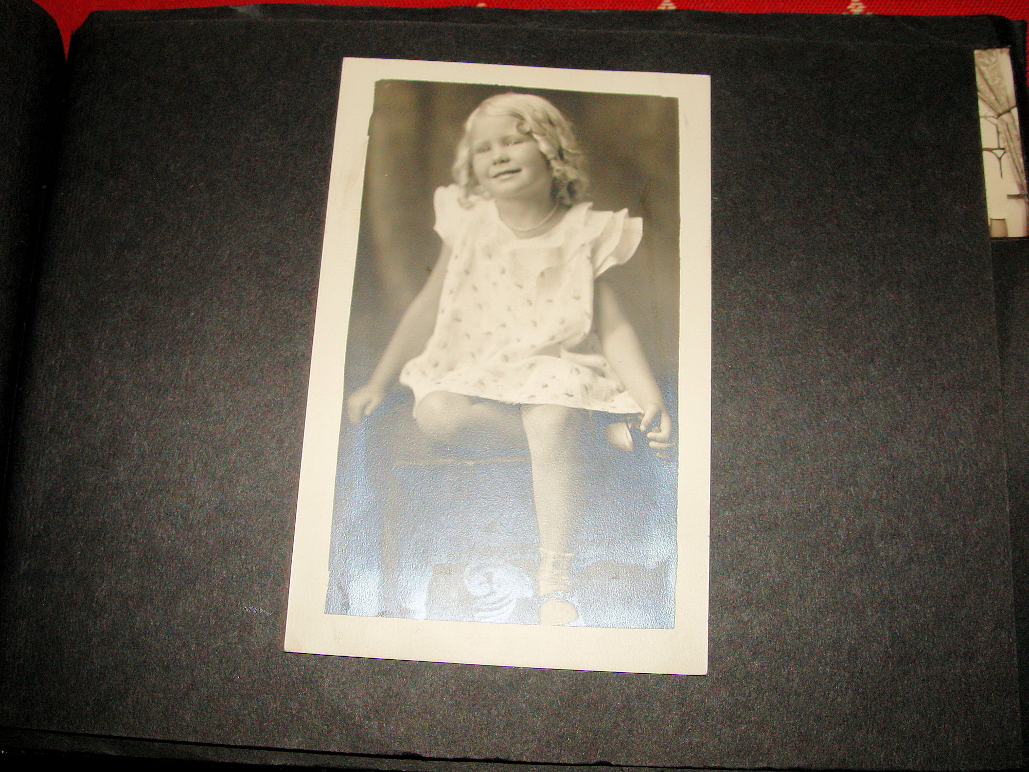 Nice photo album measuring approx. 10 inches by 7 inches. All snapshot photographs in black and white with a very few in color. Guessing this is early 1930s. Believe the little blond girl who has put her time and love into making this album was named Vera Lovina Sinjem. She wrote so nicely in it with a white ink and all in poetry. So impressive for such a little girl. She married a Kvare years later.