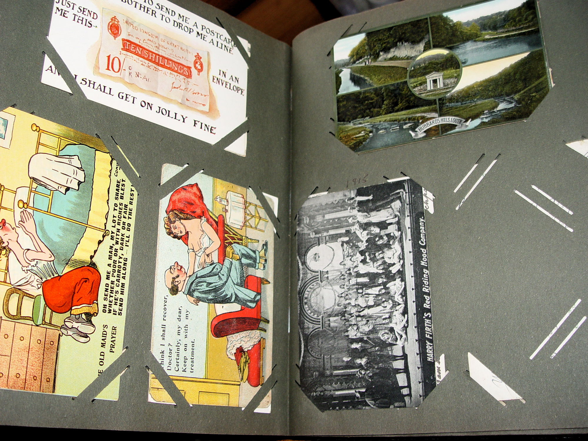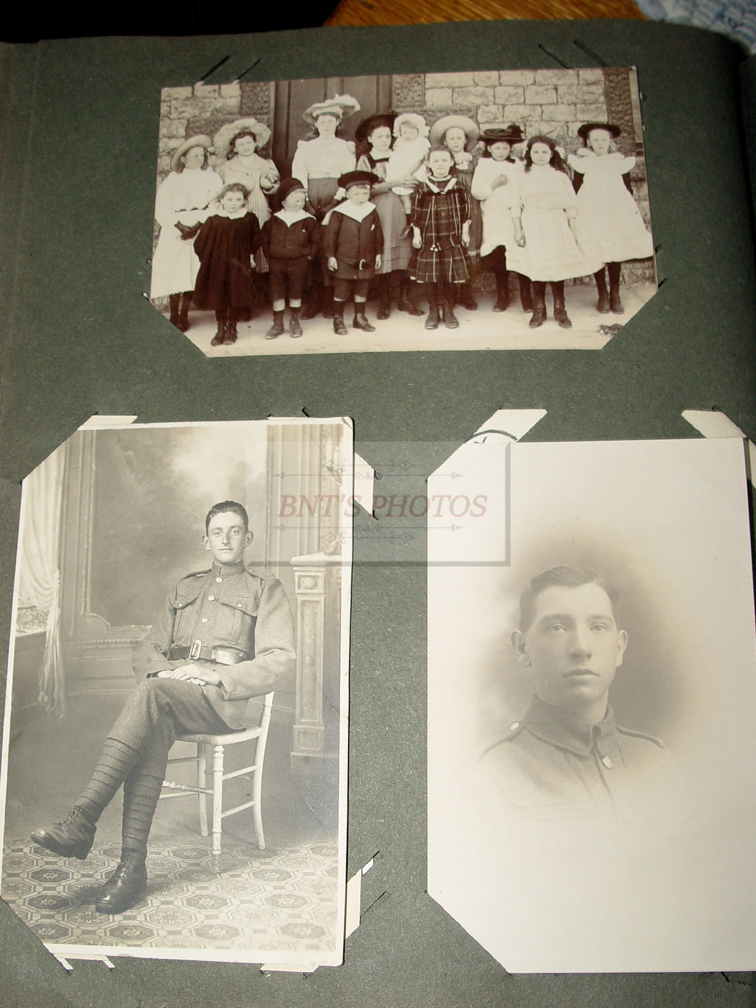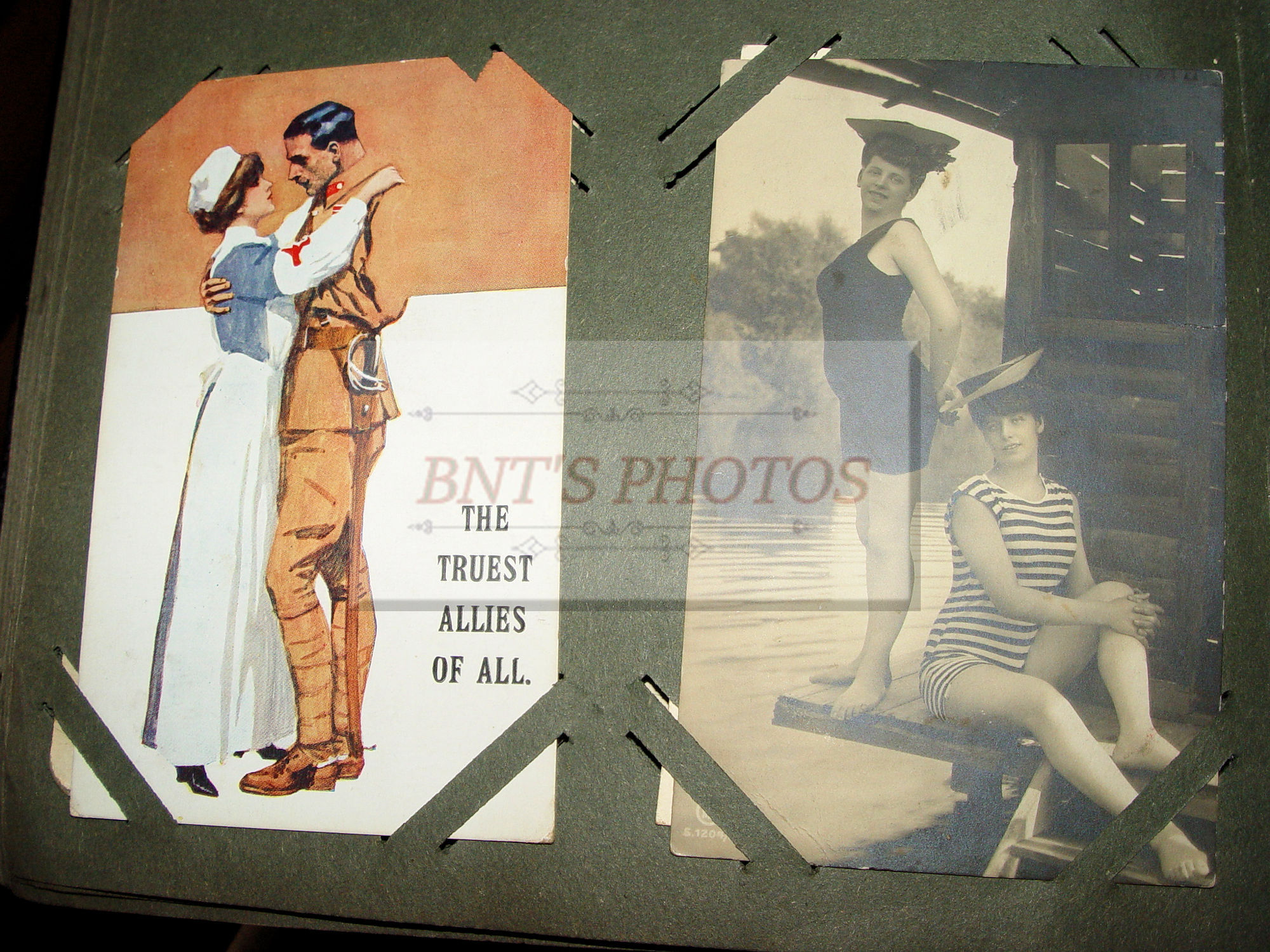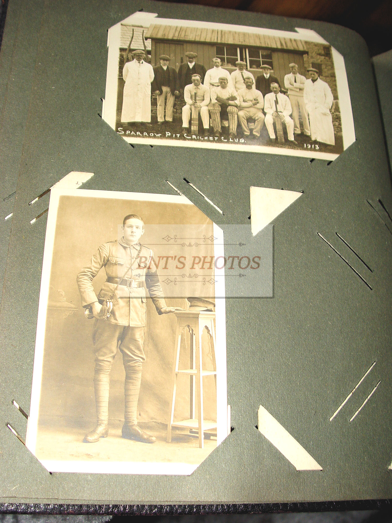 Thick and full large photo album filled with many WWI, World War One military real photo postcards. Many other unique and collectible photo cards as well. This is from an estate years ago where the family member was from Scottish decent. You will see many British soldiers and different styled uniforms from the era. From volunteers to in service. Woman, children and several showing wonderful fashion for the era. There is a Cricket Team 1913 (the Sparrow Cricket Club). Many showing town scenes and important historic images...Chapel-En-Le-Firth, Chinley and more. Young children gathering collections for the 'Radium Fund'. Two photos showing 'Dicky's Skull', Peak Districk Legend Haunted skull of Ned Dickinson from Tunstead Farm. Chinley Gala, Girls in costumes. Many humerus comic postcards and printed ones. Gay interest, cross dressing. Prisoners of War Fund and so much more ...