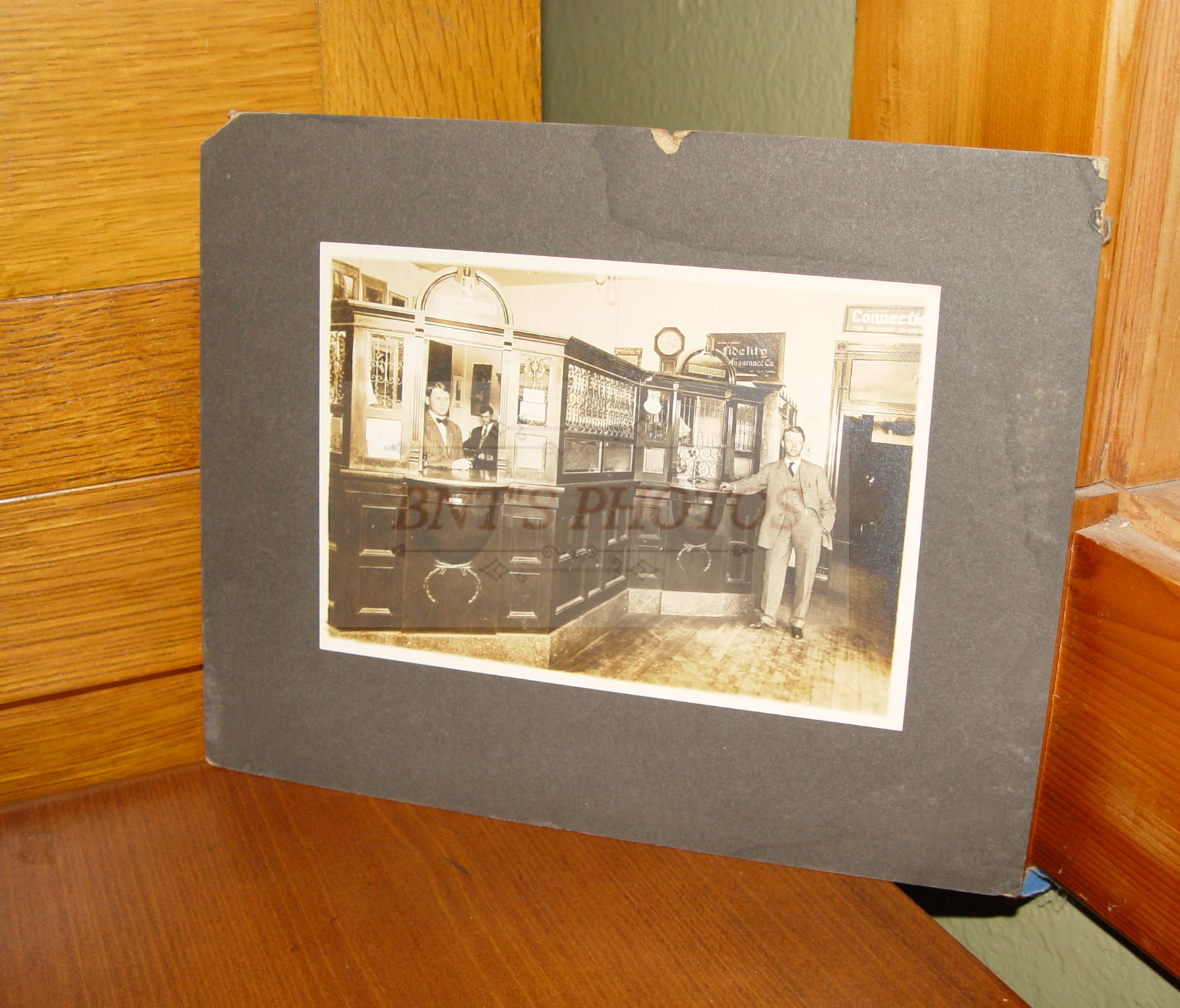The Regulator clock behind the teller window with a sign that say's Matt Parrett or Parrott and Sons. Research shows that Matthew Parrett, Iowa & Indiana was a Civil War soldier. Perhaps the same, not sure, but the previous owner said the bank was in Iowa turn of the last century. Note the Fidelity Insurance Co. of NY sign, looks to be reverse painted glass. Plus a Connection Fire Insurance Sign.