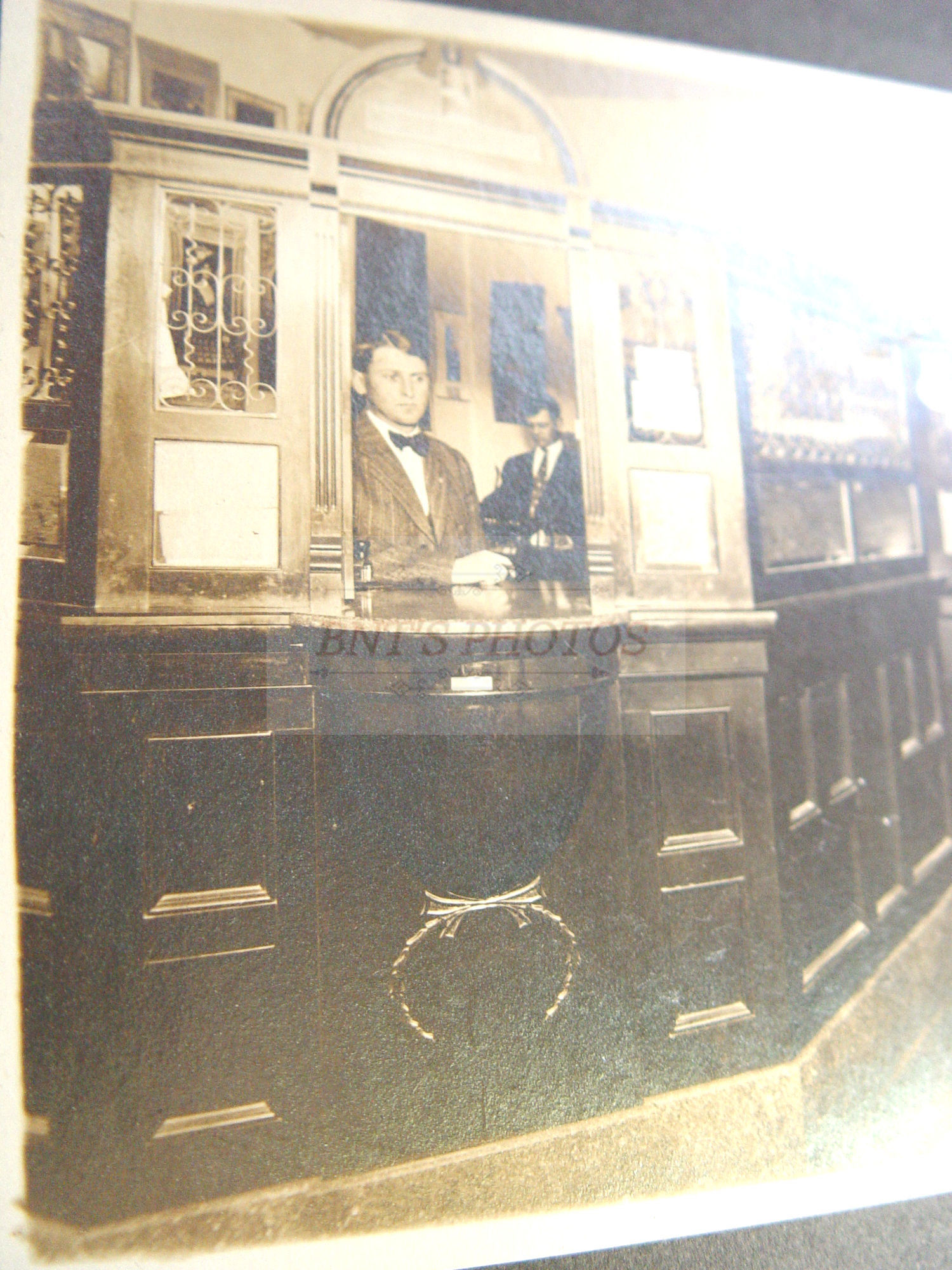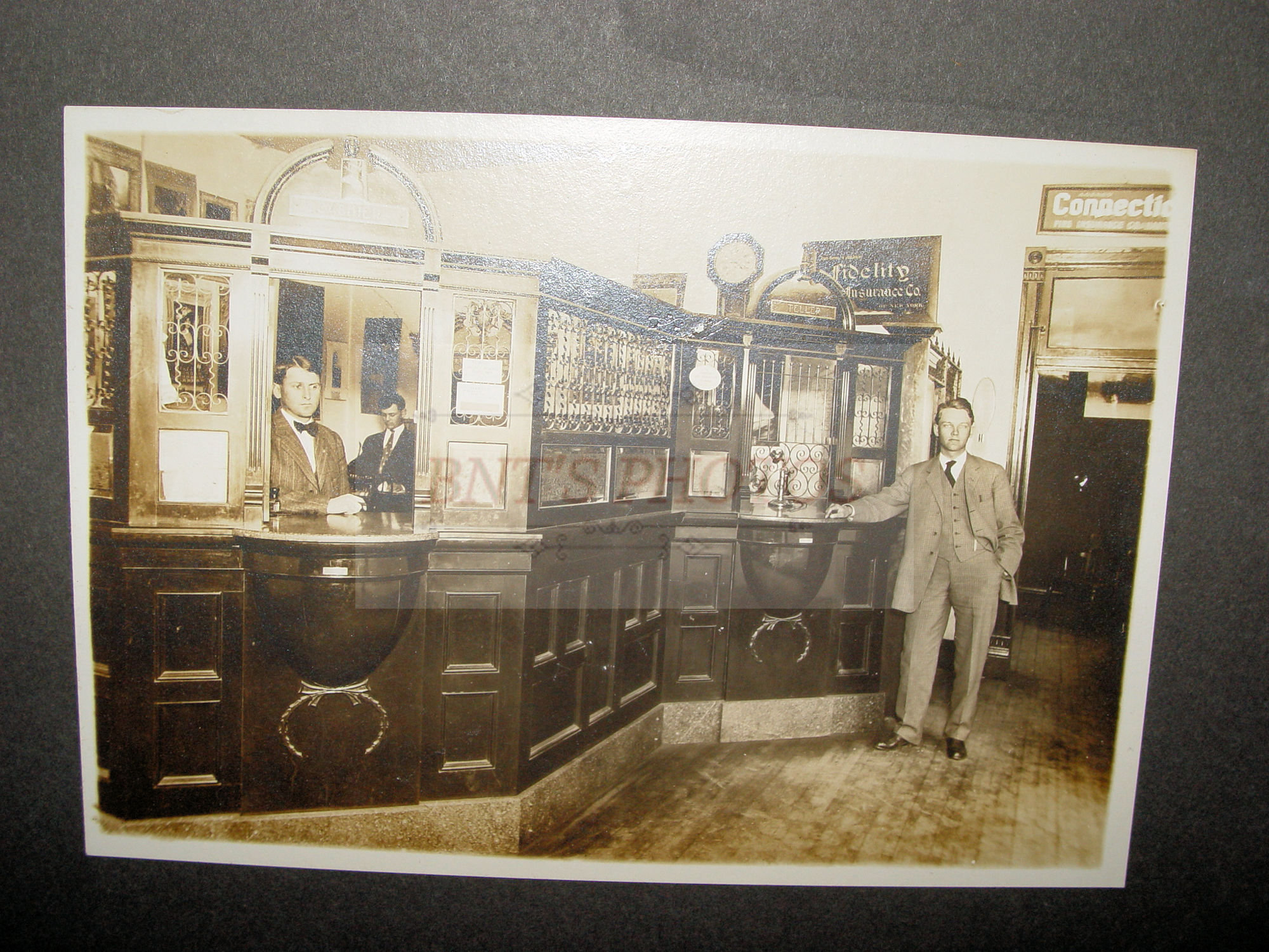 Scarce antique bank teller interior cabinet photograph said to be an Iowa bank. Employee's and very ornate dark wood with calendar's, insurance signs, regulator clock and more.