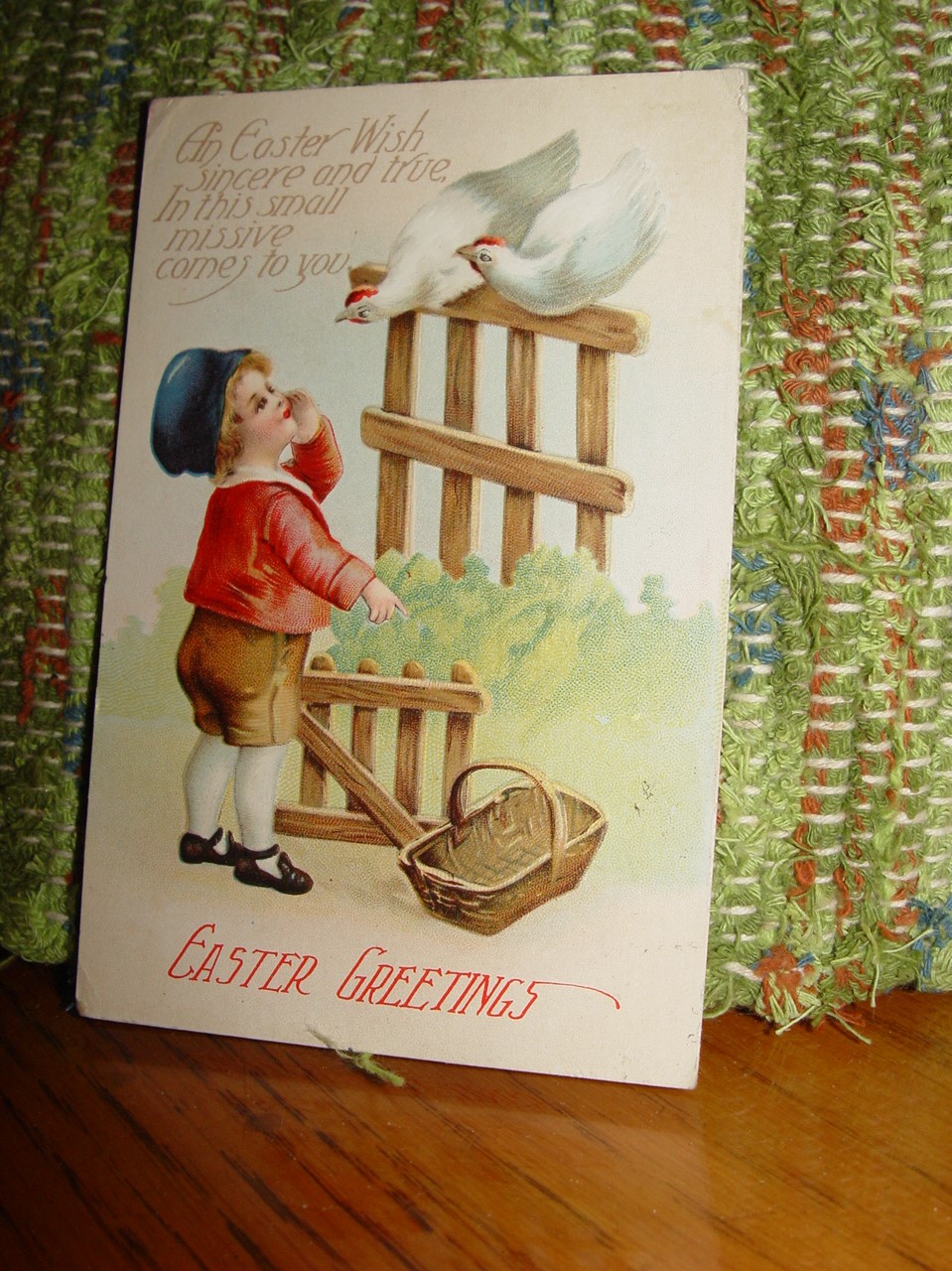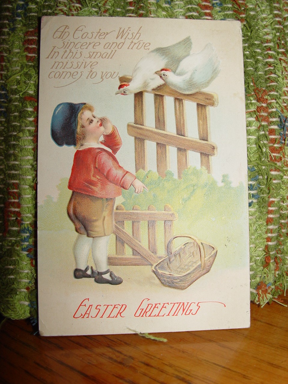 Believed to be a Ellen Clapsaddle Easter - Little Boy Wants Eggs From Chickens c1916 Postcard. Very cute little tyke telling the Hens on the fence to supply the eggs for his Easter Basket. Bold colors and very bright. Heavy embossing.