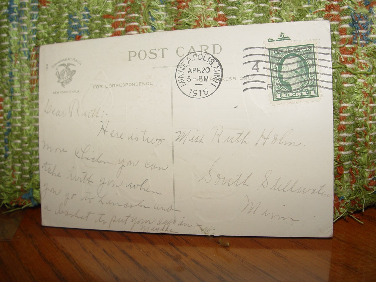 Addressed to Miss Ruth Holm of South Stillwater, Minnesota and postmarked Minneapolis 1916. This card is put out by the International Art Co. New York.