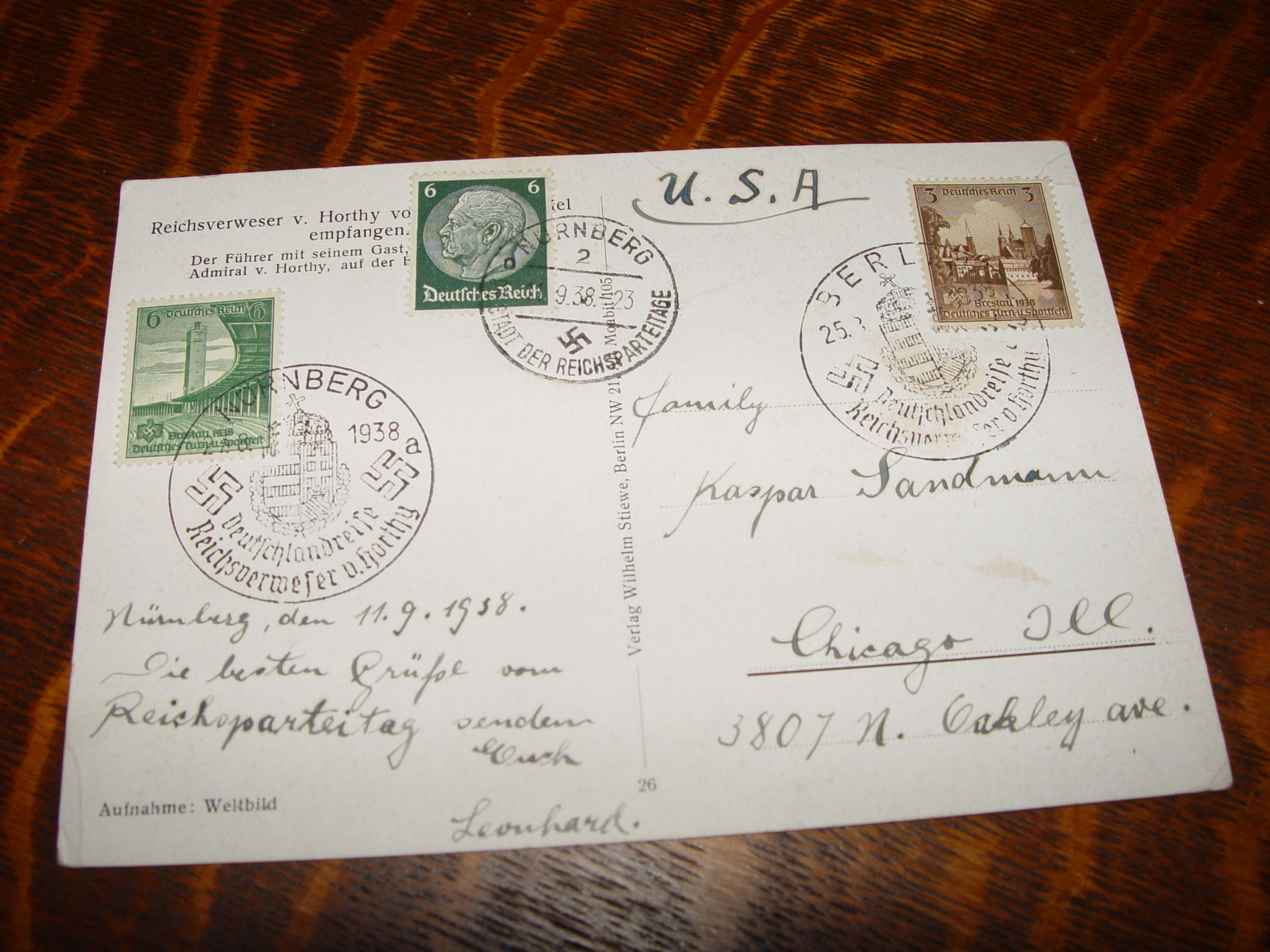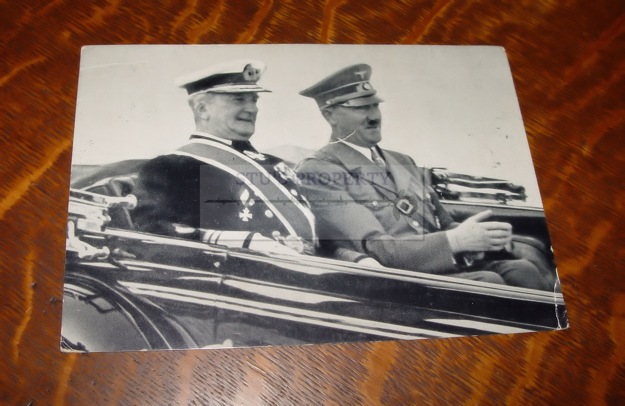Hungarian admiral Horthy during a visit with Adolf Hitler. "Reichsverweser v. Horthy vom Führer in Kiel empfangen" 1938. The two men sparred often, and eventually Hitler arranged Horthy's overthrow. This is a photographic stamped postal card with three different postmarks, three different stamps, and addressed and messaged.