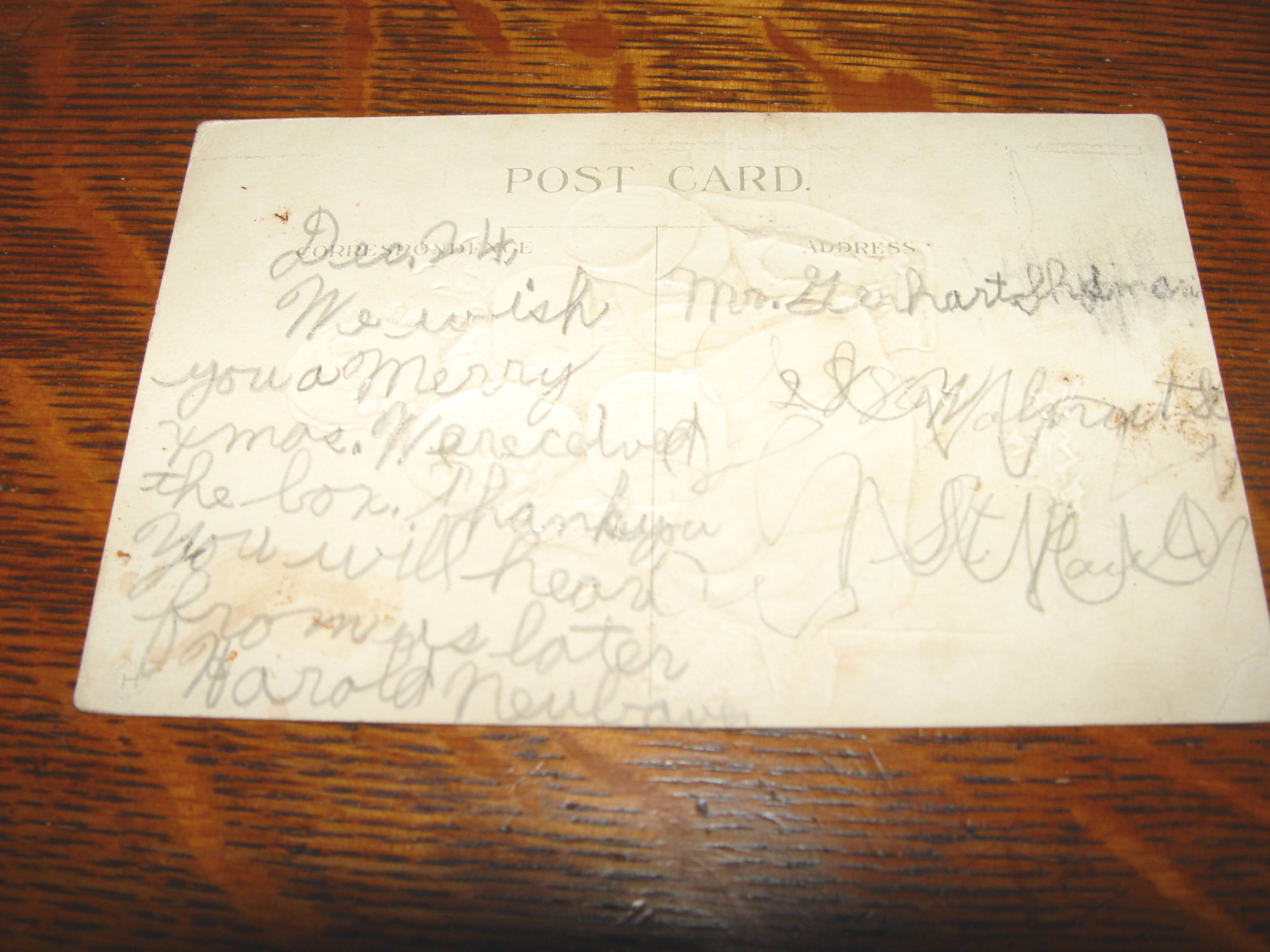 This measures 5.5" by 3.5". Great card to add to the series or display for the Holiday. Very nice shape with slightly bumped corners in great shape for the age. Slightly bumped corners. Divided back and penciled address and message by a Harold Neubauer of Minnesota.