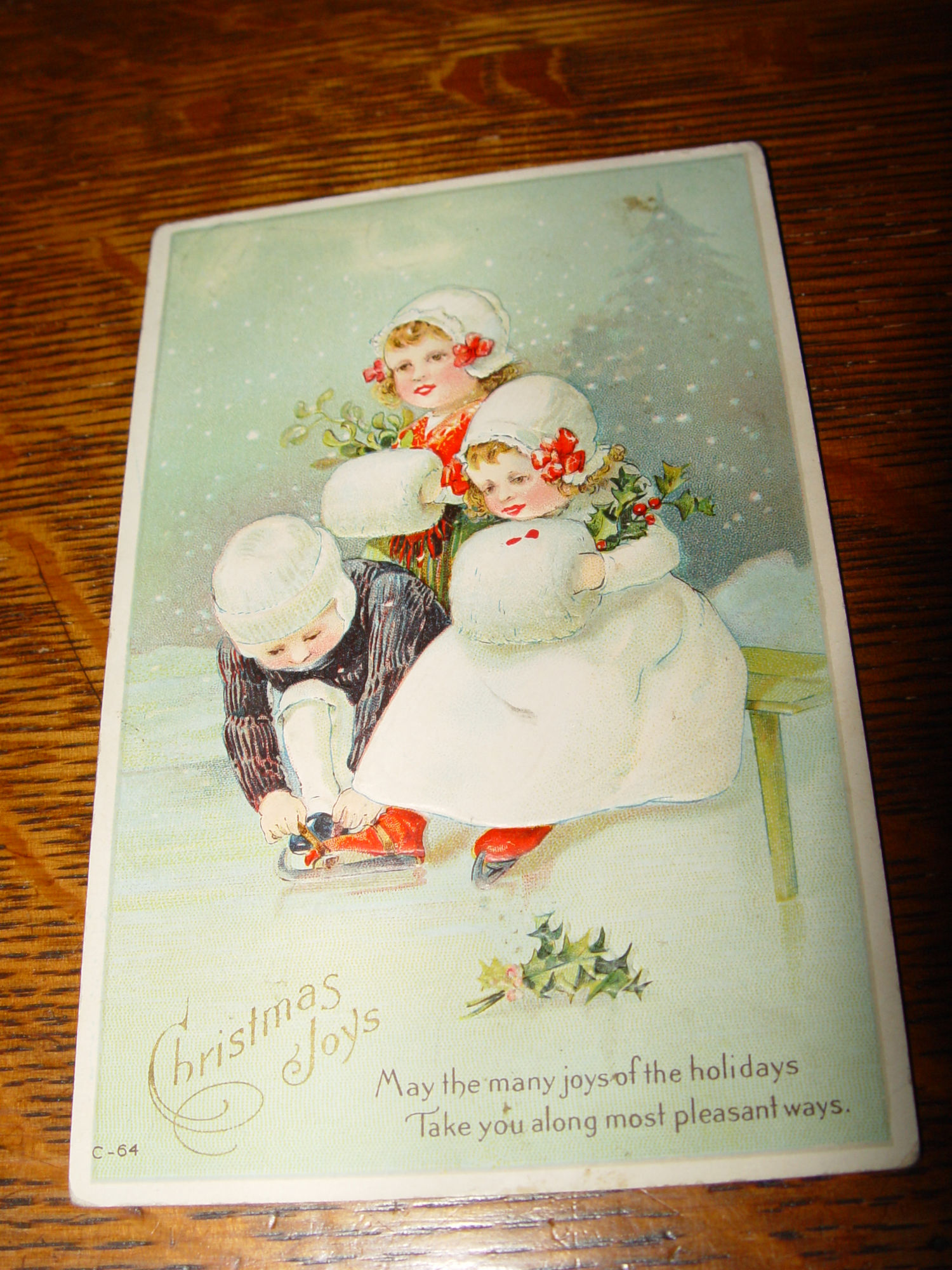 Christmas Joys! Pretty Snow Baby like children ice skating with pretty white attire. Bonnets and hand muffs with red accents. A chivalrous young boy is helping tie her ice skate on. Nash publishing.