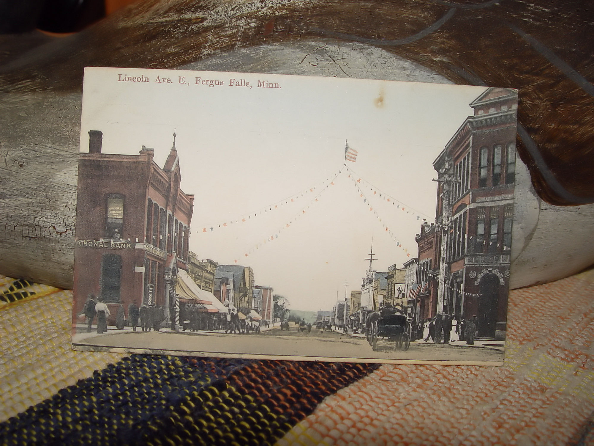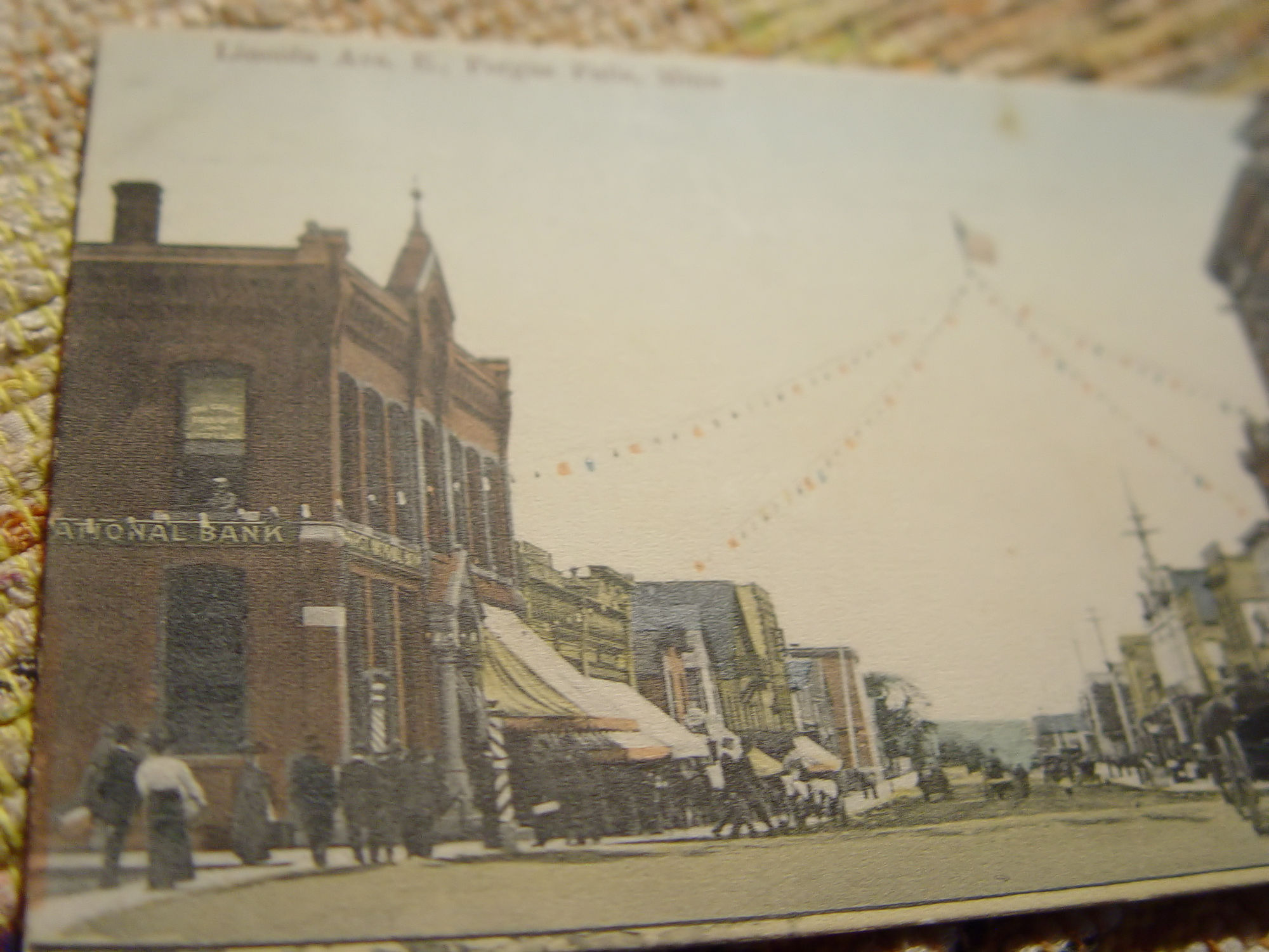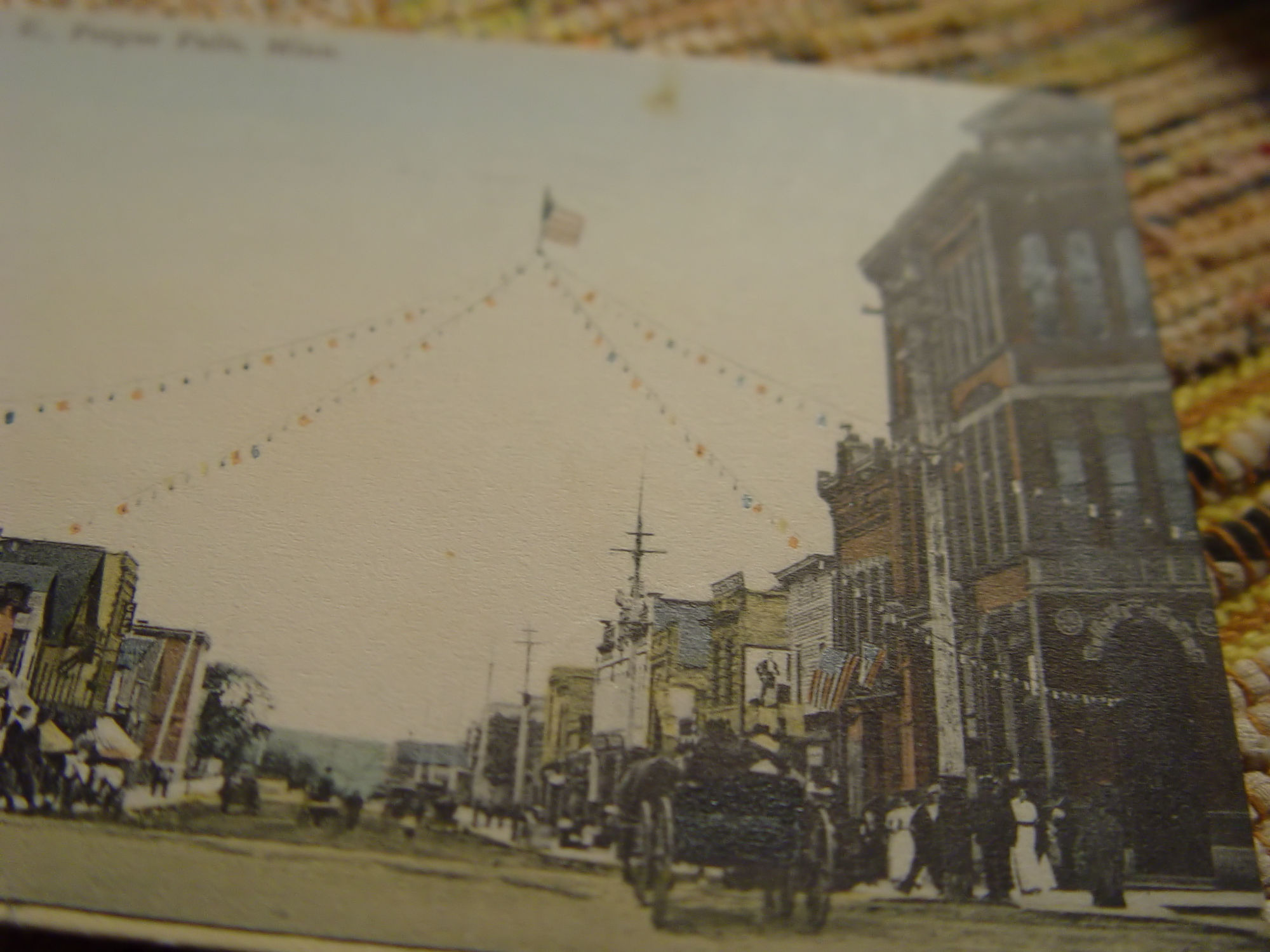 Although this is a familiar scene in postcards, this is slightly different as it is an earlier card and shows a large central American Flag with smaller flags along the lines. Gotta love the large street side Barber poles to the right.