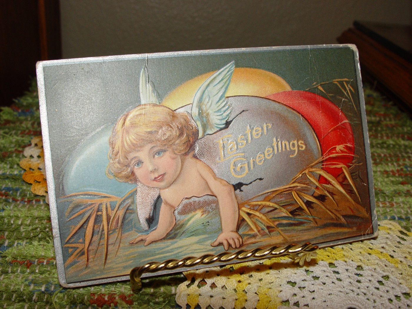 Showing a cute boy or girl crawling from an egg that has cracked open. Embossed lettering shows 'Easter Greetings' on the side. Silver, Red, Yellow, and blue for the egg. Our little angle has blue wings and rosy cheeks. Address to Arthur Wordes of Renville Mn, originally the family was from Iowa. This is postmarked Cedar Grove Wisconsin. Signed Ulysses G. A vintage postcard can be a unique, thoughtful gift, tucked into a greeting card with a personal note is a fun way of giving for any Holiday. This is a very nice card but shows some creases to the left of center. Four corners bumped.