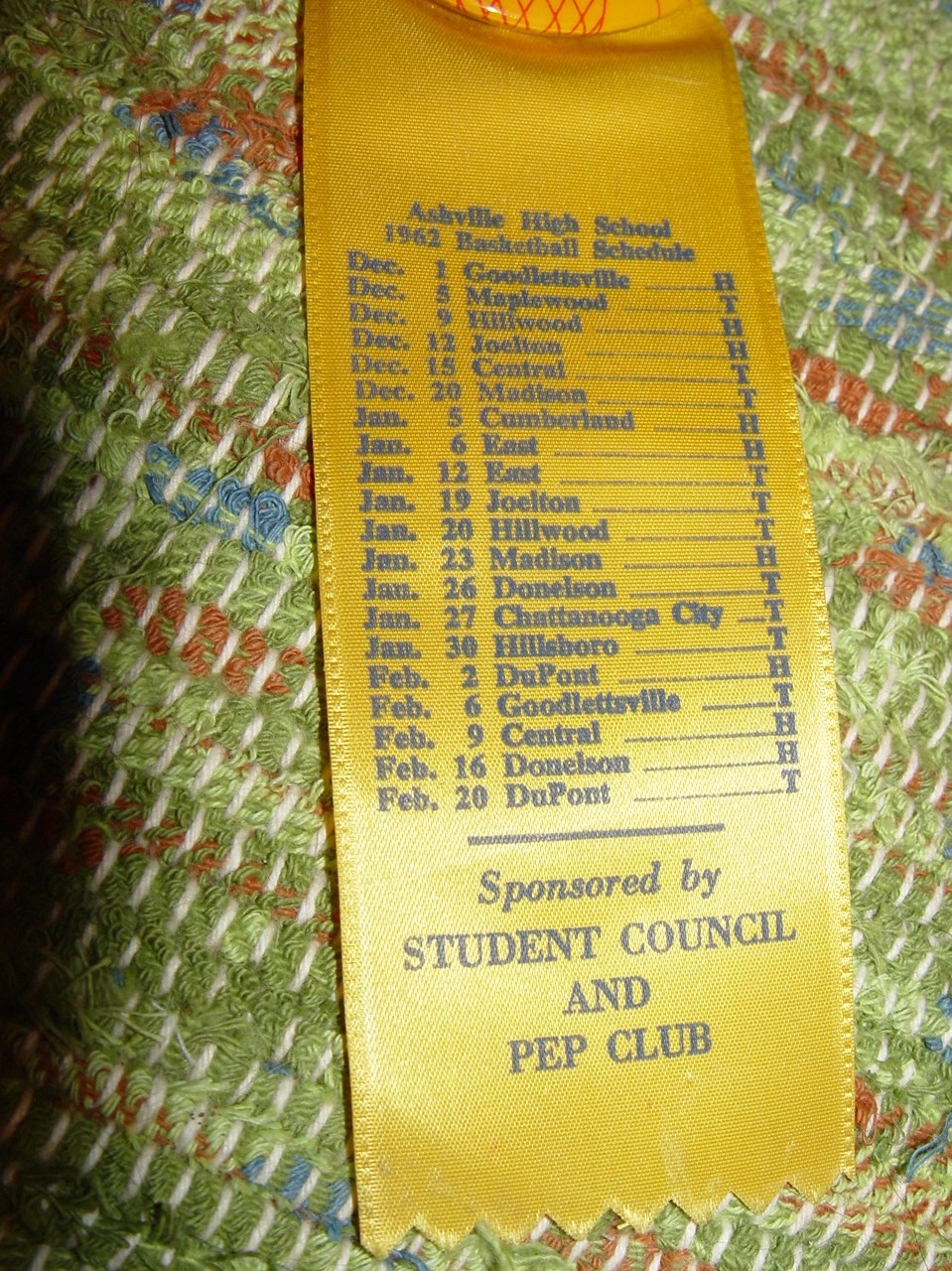 The ribbon shows; Ashville High School 1962 Basketball Schedule. Some of the cities that make me think Tennessee are Chattanooga City, Goodlettsville, Cumberland, Donelson etc. Excellent design and in very good shape. A little spot of black at the bottom back of the ribbon. Approx. measurements; 2.25" Diameter button and 7" long whole piece.