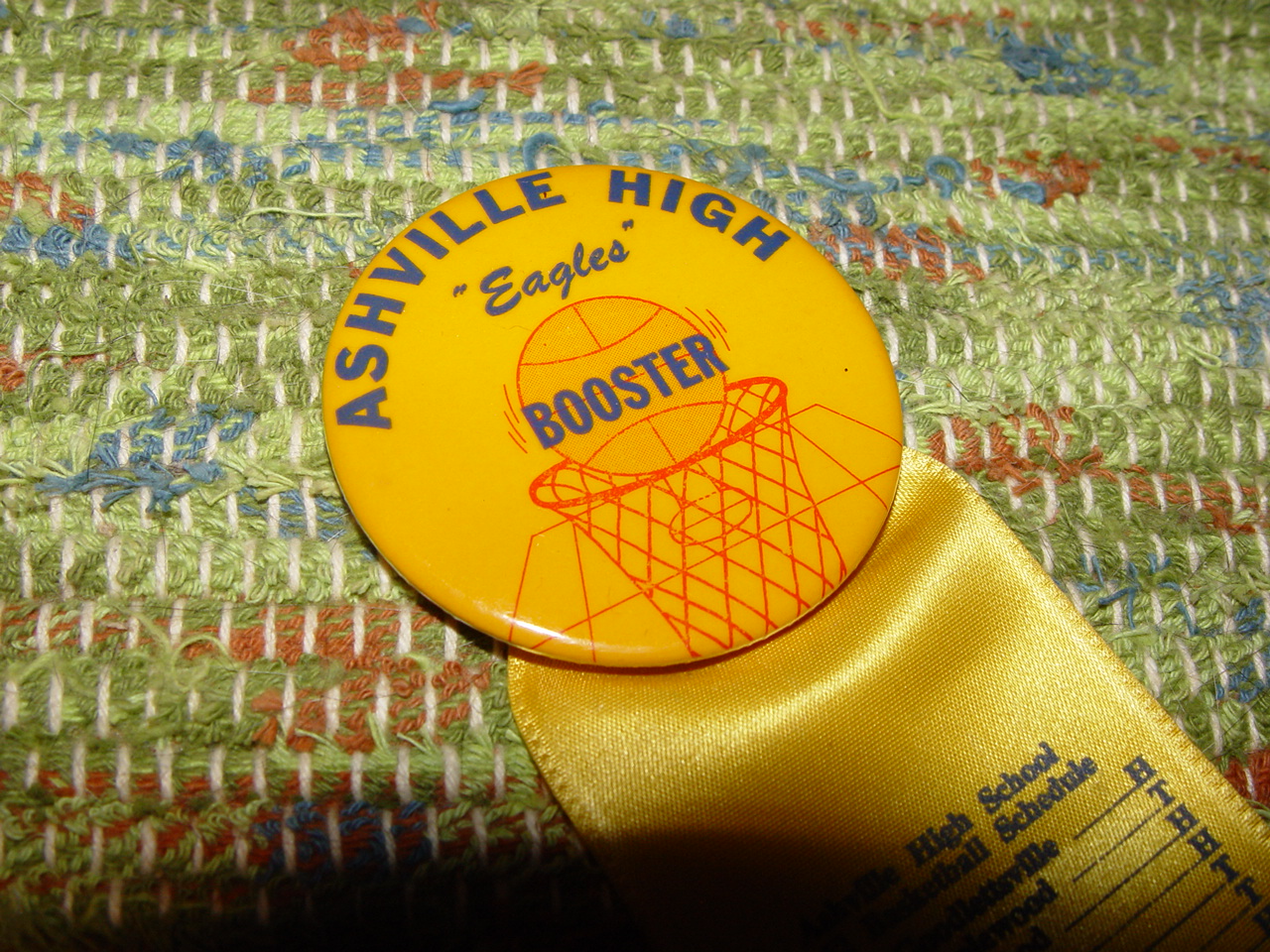This is showing a gold ribbon and orange button, blue lettering with the words "Ashville (spelled without the 'e') High "Eagles" Booster with a graphic of a basketball hoop and ball.