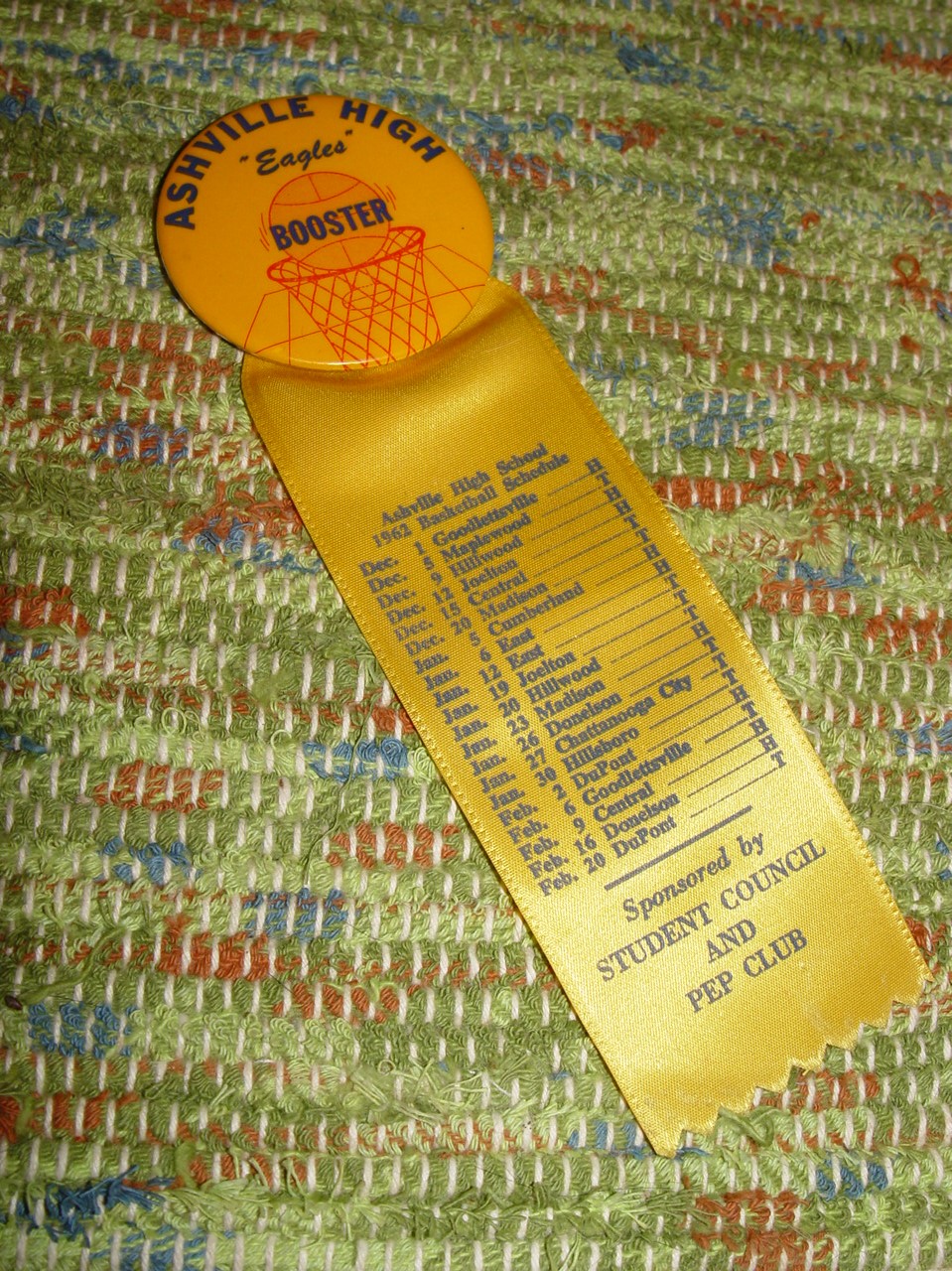 Vintage basketball ribboned pinback. Believed to be the Ashville High Tennessee Golden Eagles when looking up the cities on the ribbon. It looks like in 1962 the team coach was John Oldham. Please let me know if I'm incorrect.