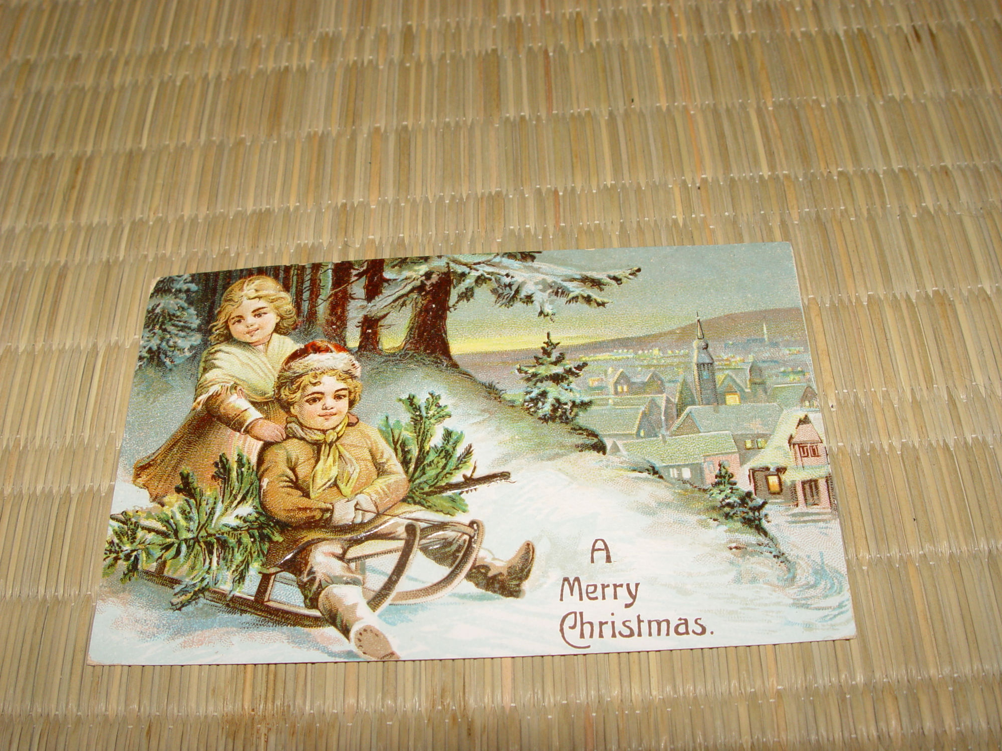 Victorian era Christmas postcard, Brother and Sister bringing home the Christmas tree on a snow cover hill and enjoying a sleigh ride too.