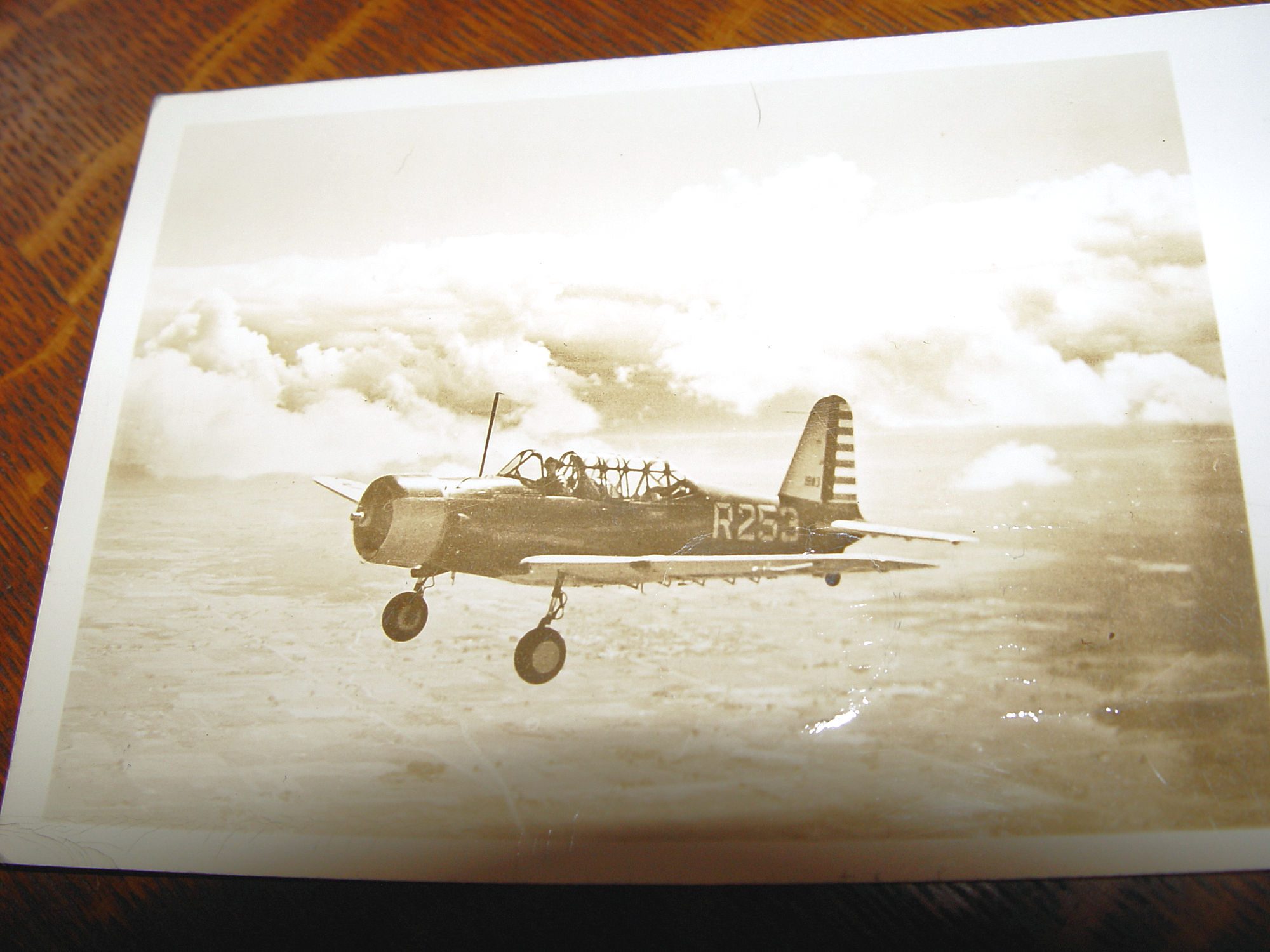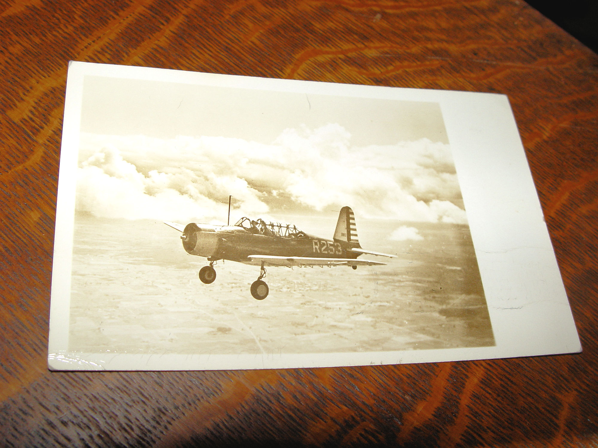 Great real photo postcard of a piloted airplane, World War II era. On the back of the card the pilot? and writer mentions the AT-17 plane, not the one on the front of the plane. Situated over what looks to be fields and land, beautiful cloud formations behind the plane. Note the pilot appears to be looking at the cameraman. I believe the tail numbers or serial numbers are what is referred to at the rear. R253.