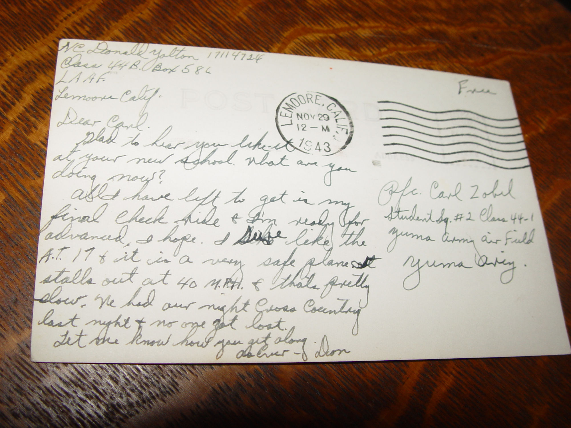Sent by NC Donald Yolton Class 44B (1917 - 1982 La Crosse Wisc. - La Crescent, Minnesota) and sent to Pfc. Carl Zobel of Yuma AZ.