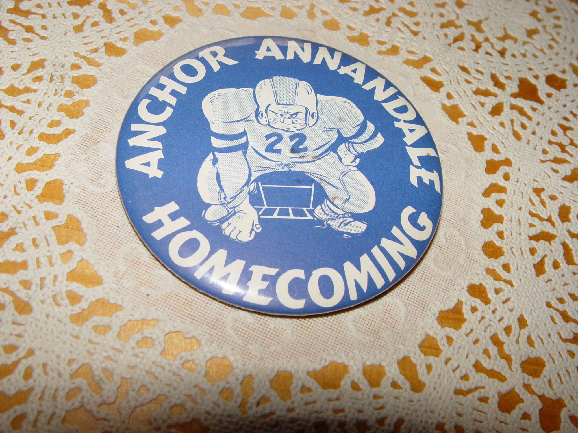 Annondale Minnesota is a town in Wright County, Minnesota. This pinback button shows a caricature of a football player on the front in white with white lettering against a blue background.