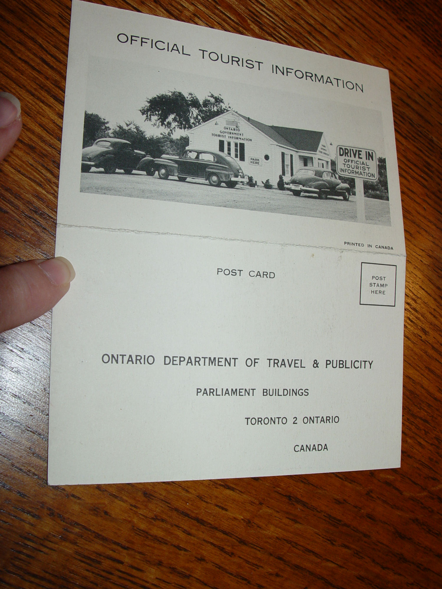 This is an unused and super nice postcard that the Ontario Government had issued. Looking at the vintage cars, this appears to be late 30's & early 40's. There is a Coupe, Plymouth and another sedan in front of the Ontario Government Tourist Information Center.