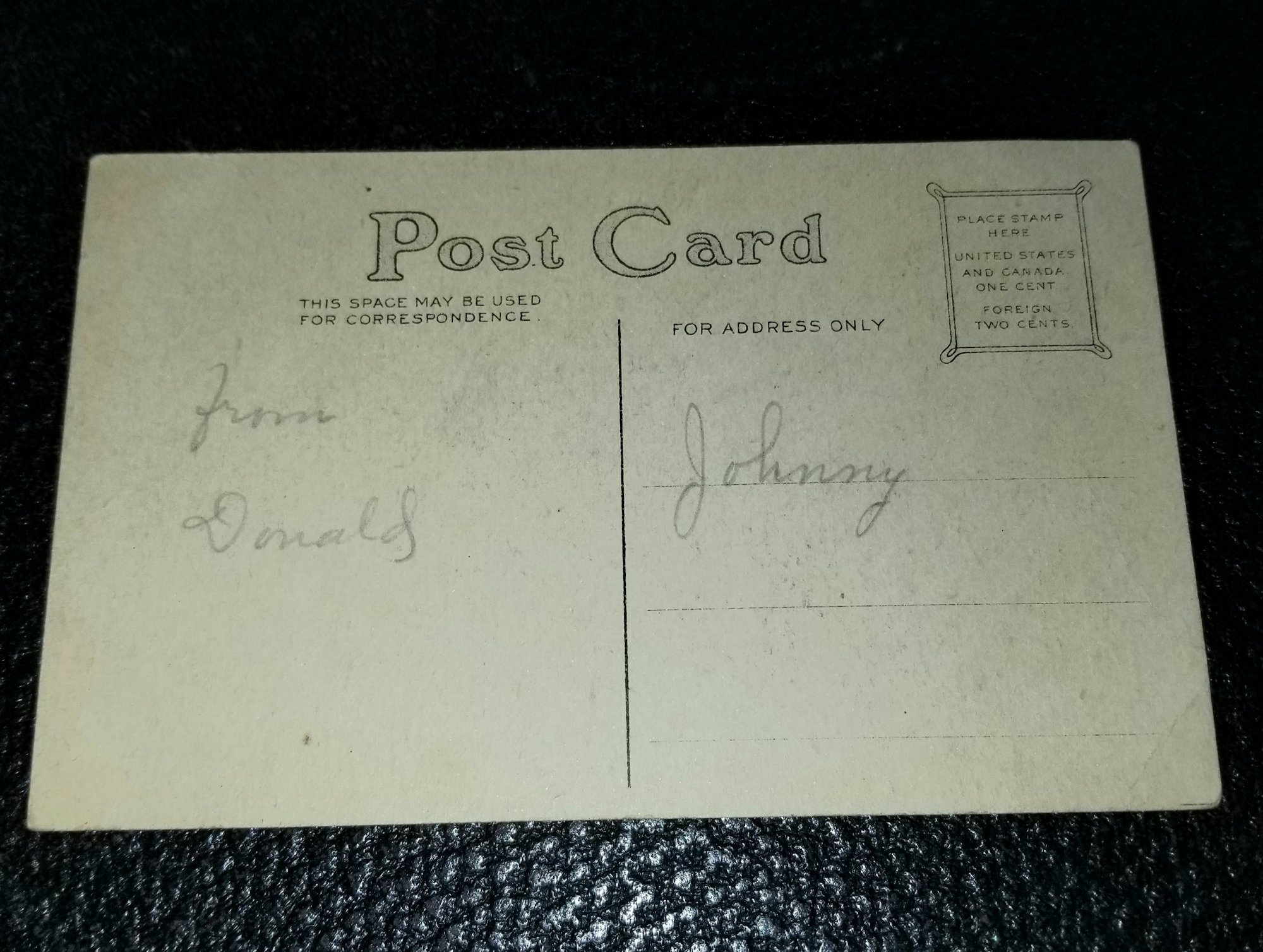 This is un-sent but addressed to Johnny from Donald in pencil. Measures approx. 3.5" by 5.5". Please view all pictures and read description. Let me know if you have any questions.