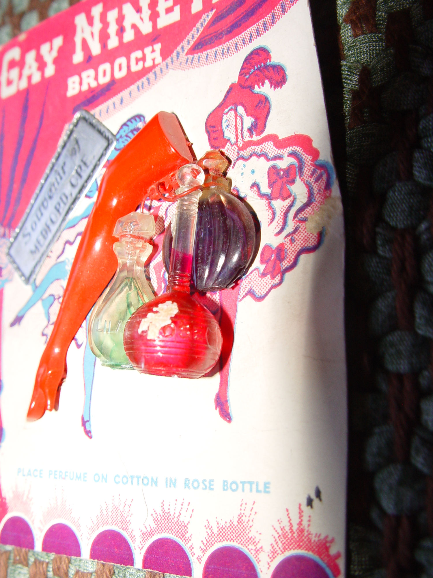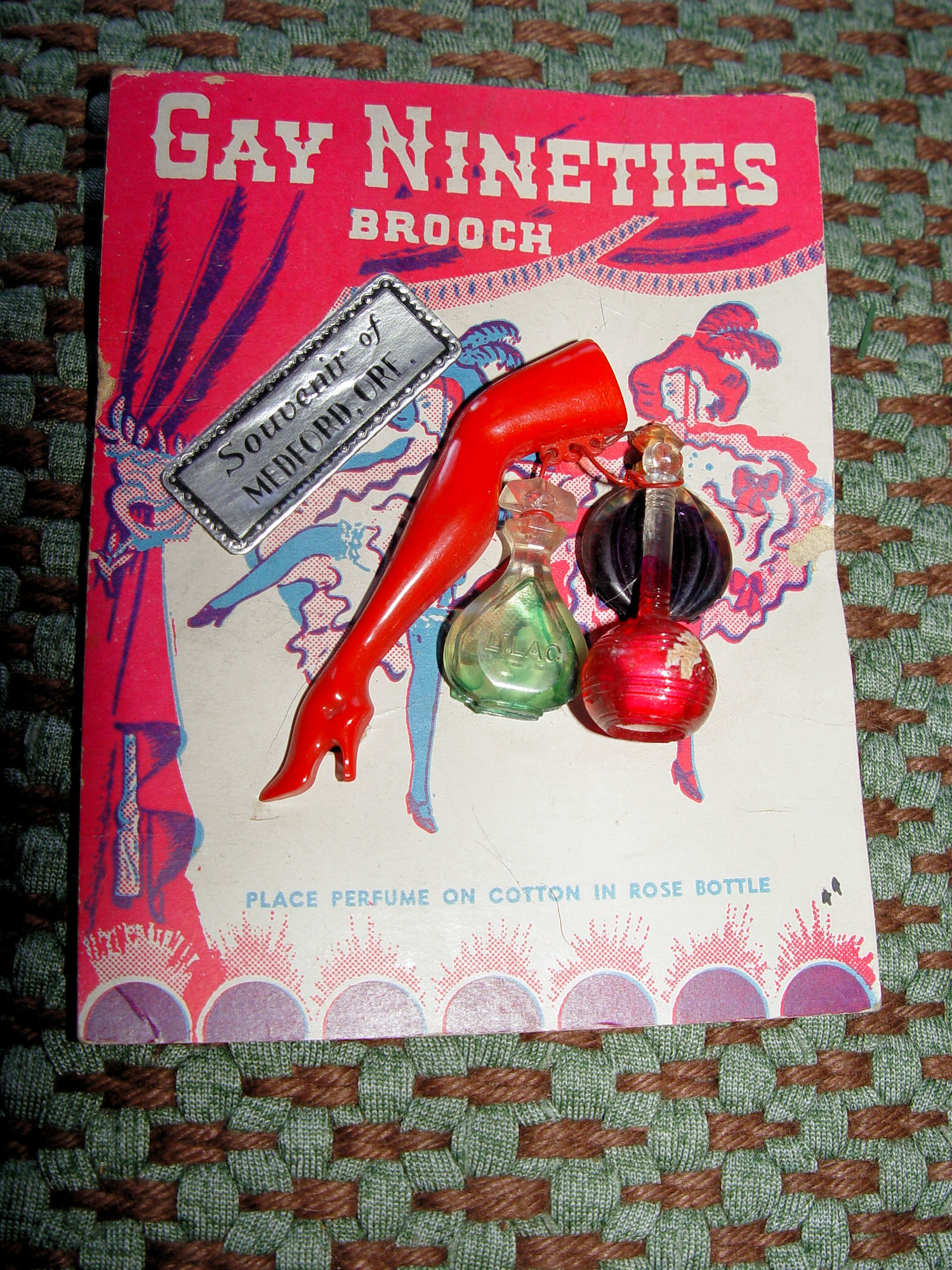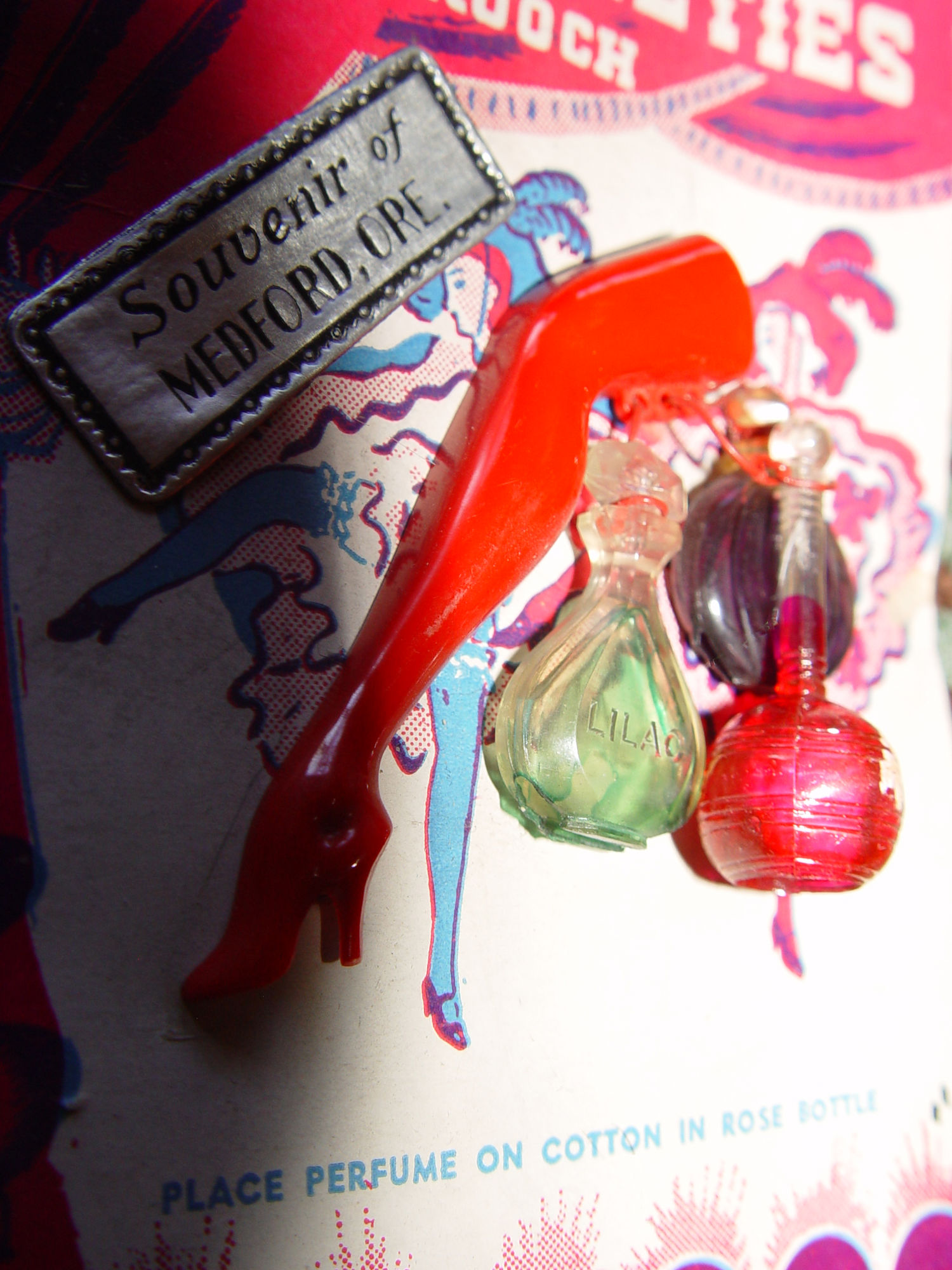 Rare find. Souvenir of Medford, Oregon vintage pinback brooch with a hard plastic dancer's leg replicating the Gay Nineties Ziegfield girls high kicks. Also 2 small perfume vials and a red cotton bottle for dabbing.
