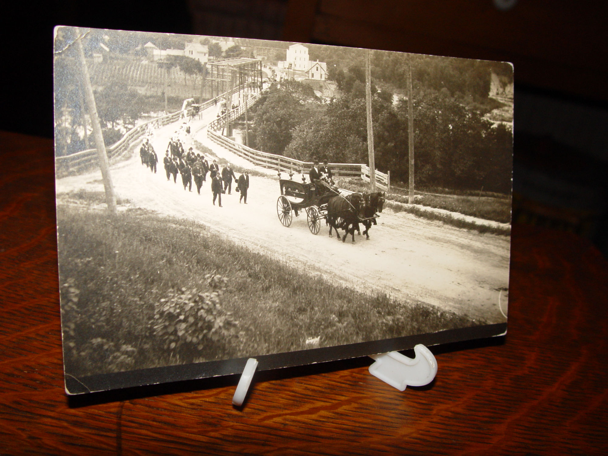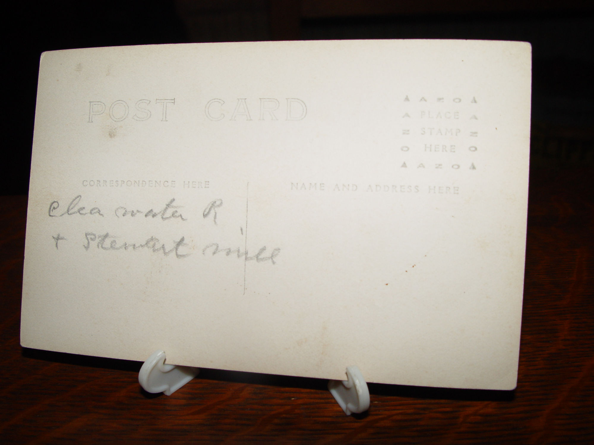 This is a huge funeral procession and surely carried the death of a notable person. The funeral car is very ornate, with glass or open sides to view the casket. As can be seen, many mournful folks behind the horse pulled car. The man in front has his head very low in sorrow. I've tried to find where a important passing occurred but to no avail. The procession carries all through the town and the bridge. On the back it states, Clearwater R & Stewart Mill. This would be the route to the Clearwater Cemetery.