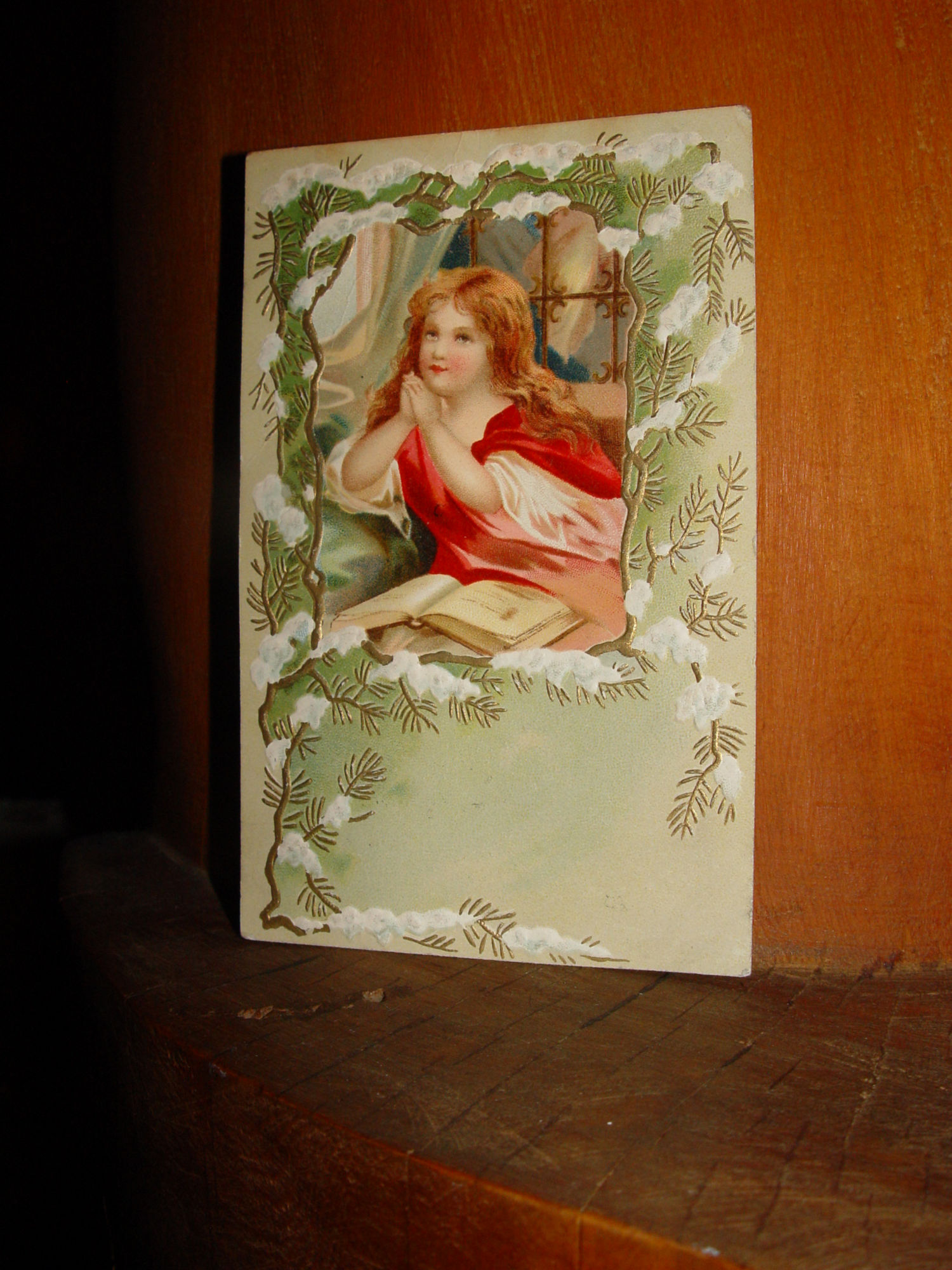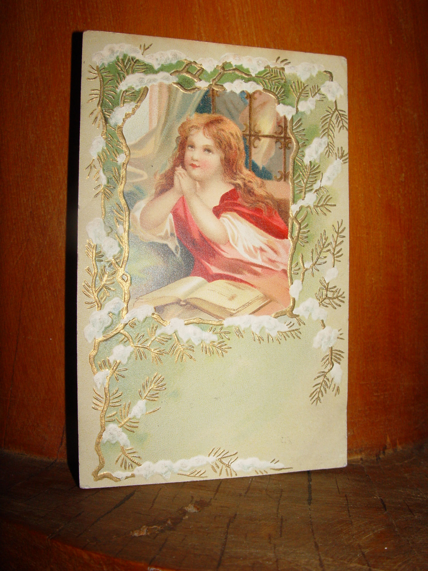 Embossed Religious Postcard. Beautiful picture of a young girl with red hair and a bible on her lap. Not sure if she is praying or not. Pretty deep red and pink robes. Love the snow topped pinetree border which leads me to believe this may be a Christmas PC.