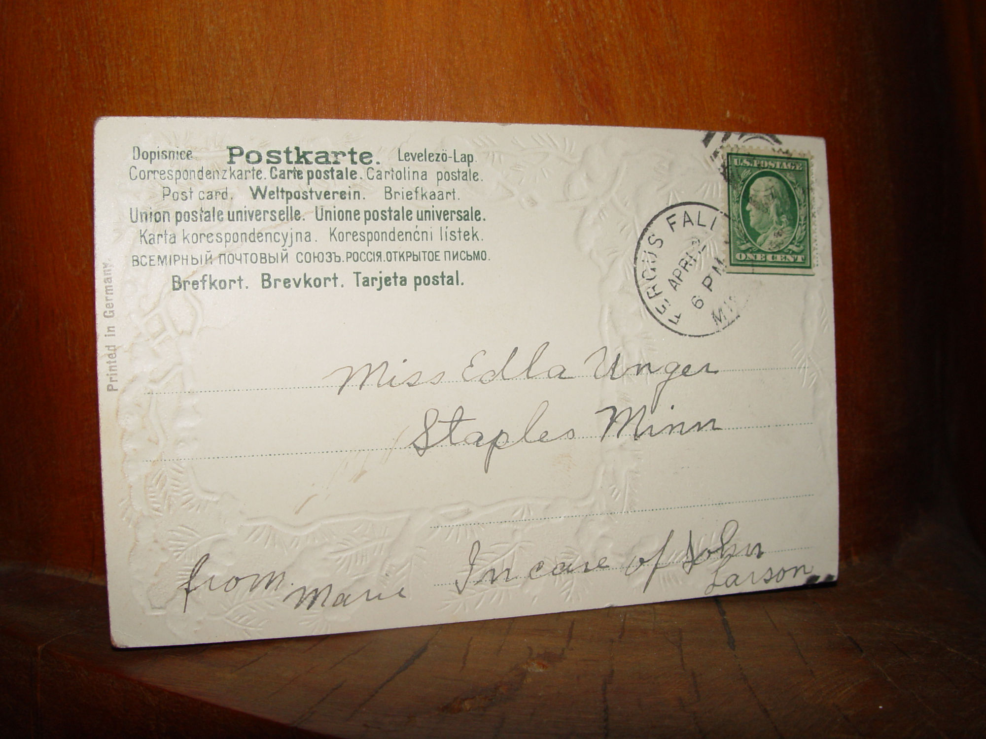 Very good condition for the age with only minimal wear at corners. Used and sent to Edla Unger of Staples Minnesota. Some history for family research purposes - Miss Edla O. Unger (Edla Otelia Regina Unger 1849 and 1909 -- Daughter of Olaf Unger and Ingaborg (Stenmark) Unger. Wife of Oliver Sigurd Hanson. Mother of Walter Hanson) as found via internet.