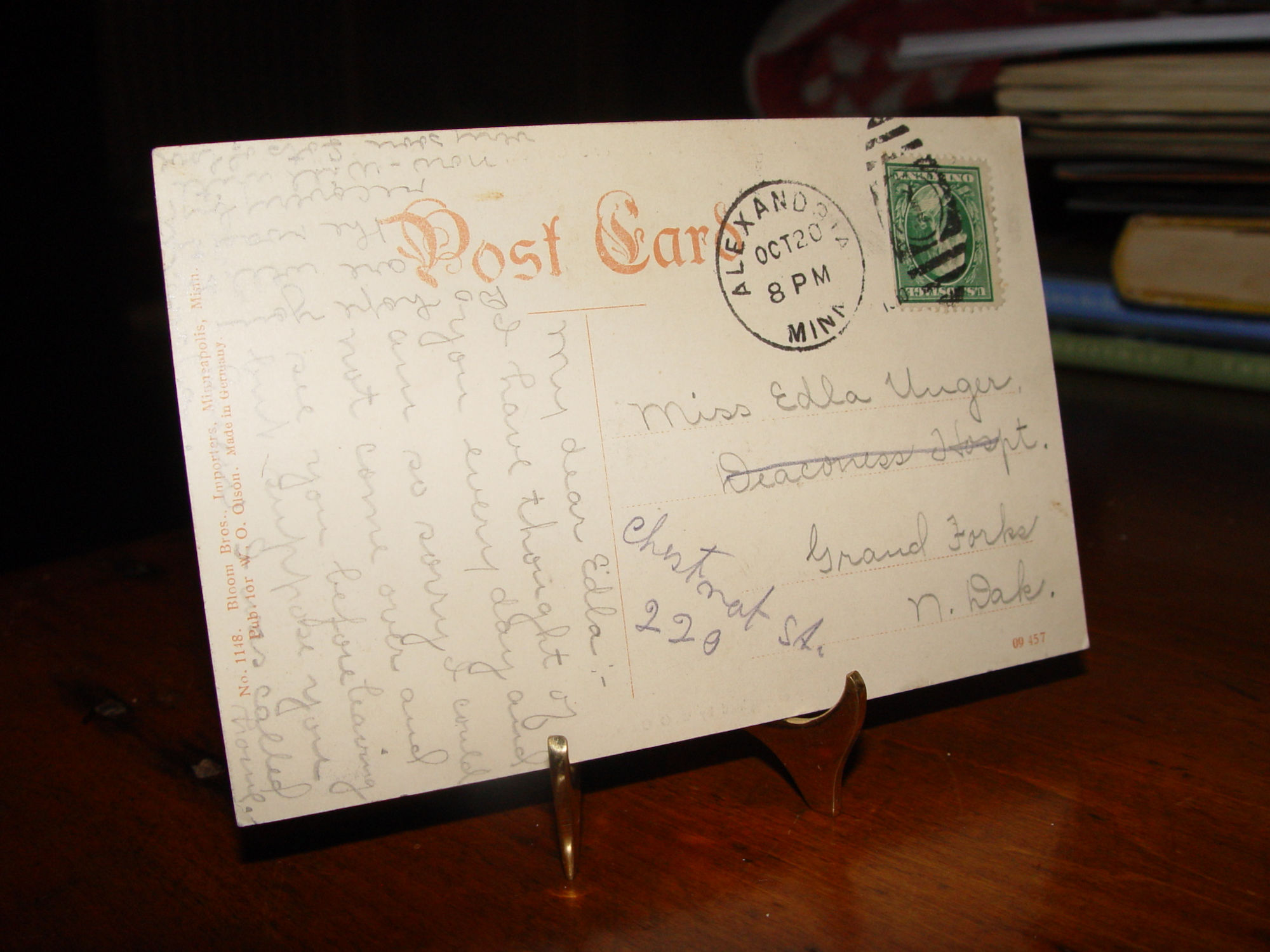 Posted and used. This is in very good condition with only slightly bumped corners. Addressed to Miss Edla Unger of Grand Forks, North Dakota.