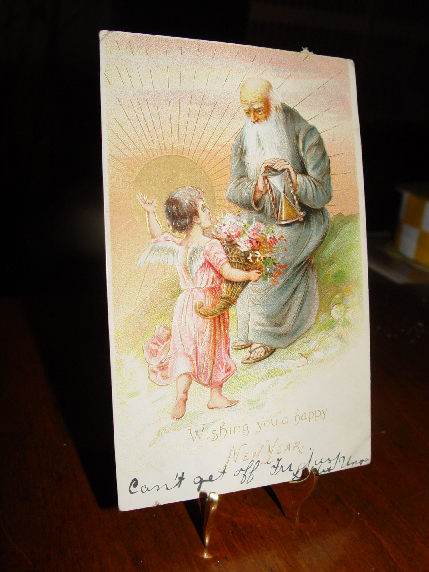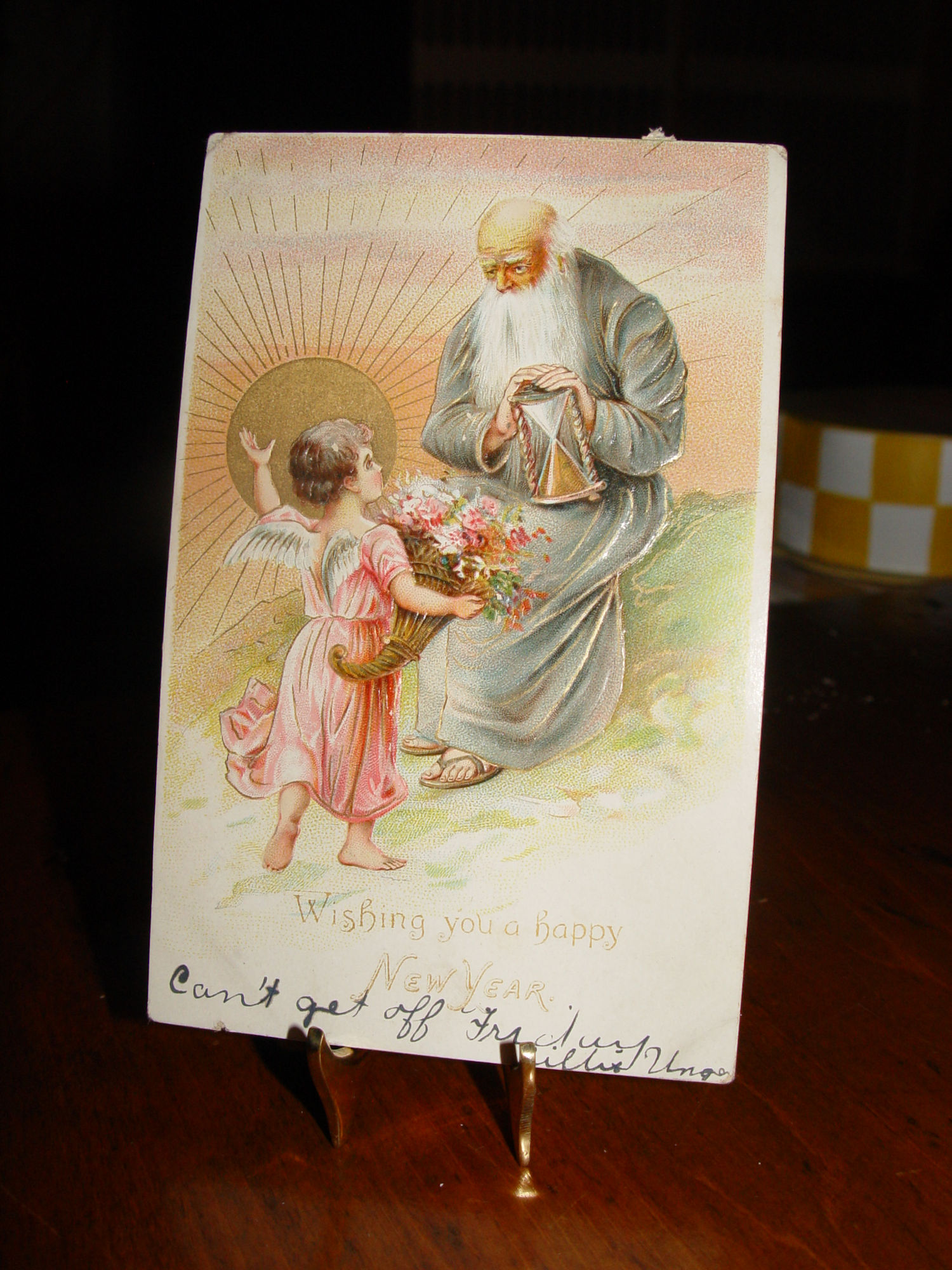 This neat embossed postcard I believe is from Raphael Tuck & Sons where they feature Father Time with an hourglass and a cherub with flowers for New Year's.