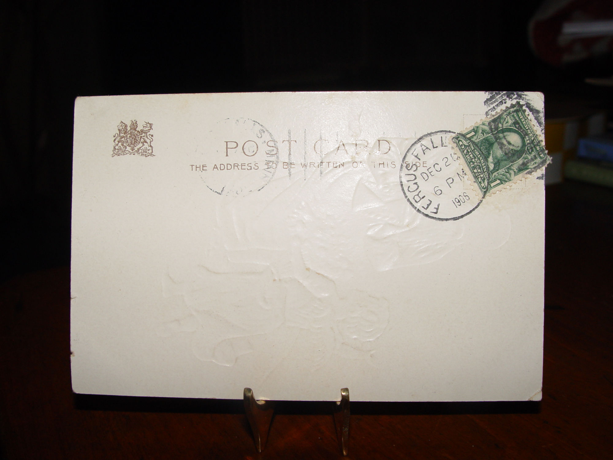 Nothing on the back but only below the front of the card. "Can't get off Friday, Lillis Unger". Mailed and postmarked1906 from Fergus Falls, Minnesota. This is from the estate of Edla Unger who lived in Grand Forks ND and Staples, MN. Not sure why postmarked but no address to be found. Undivided card.